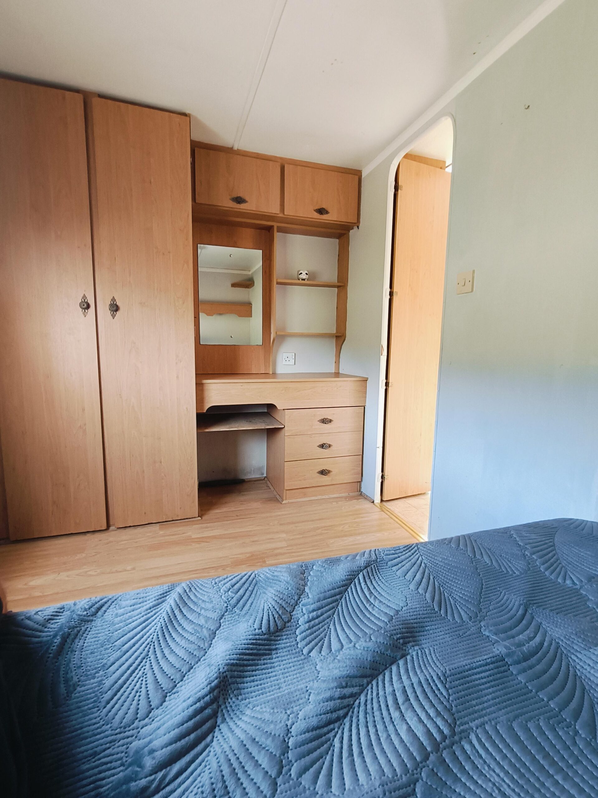 W jednej z sypialni mieści się garderoba duże łóżko małżeńskie meble, szafy.