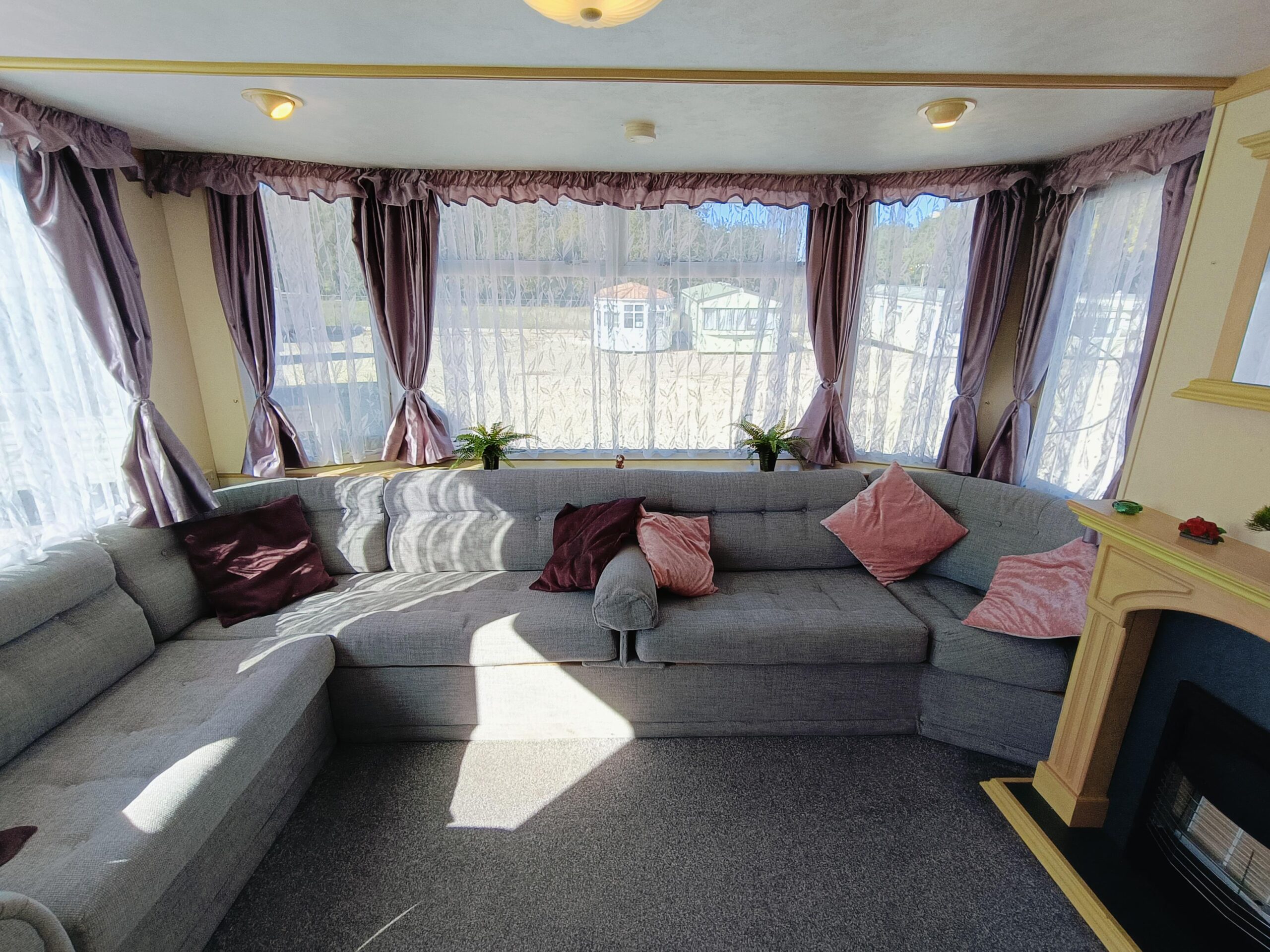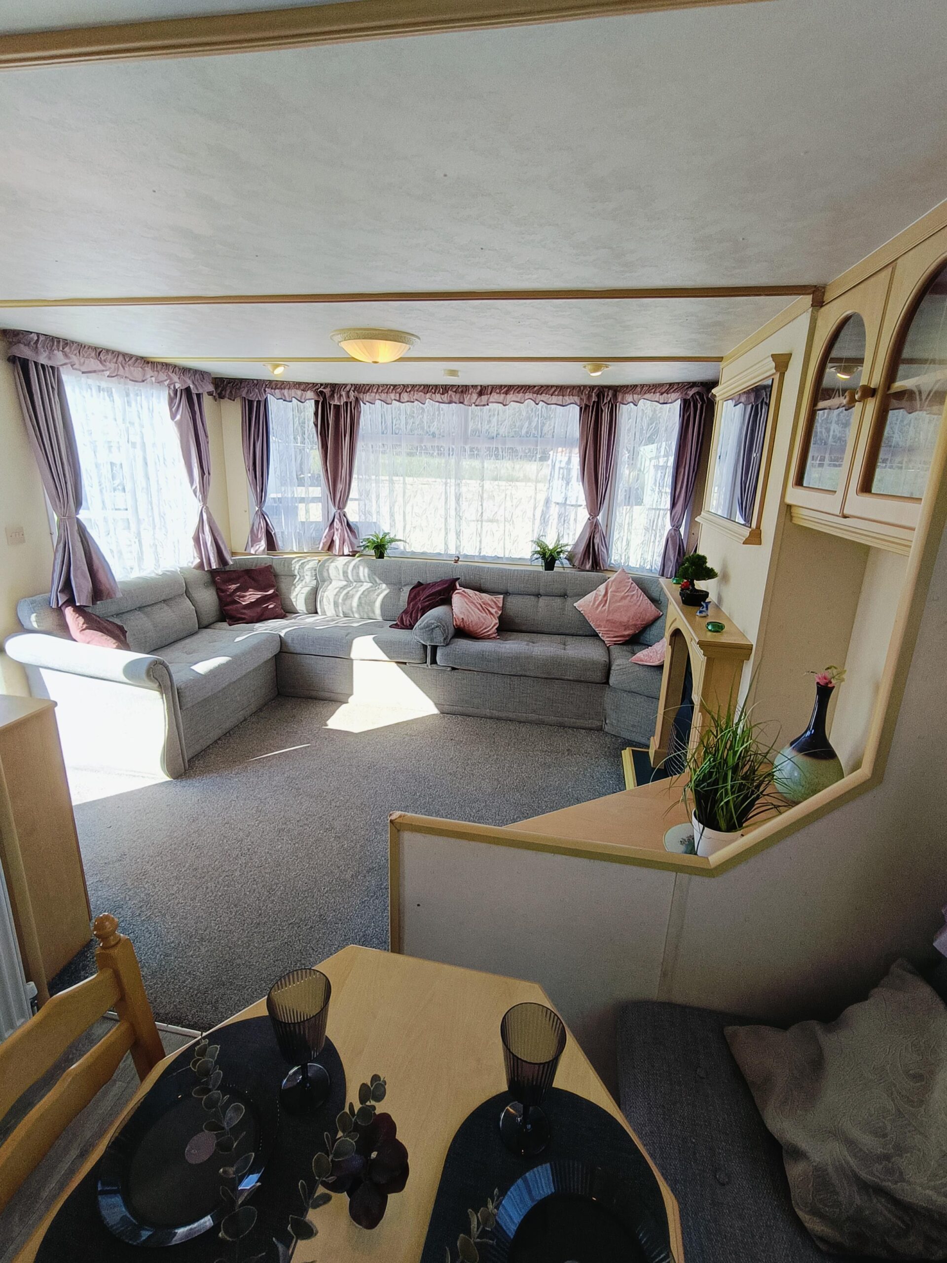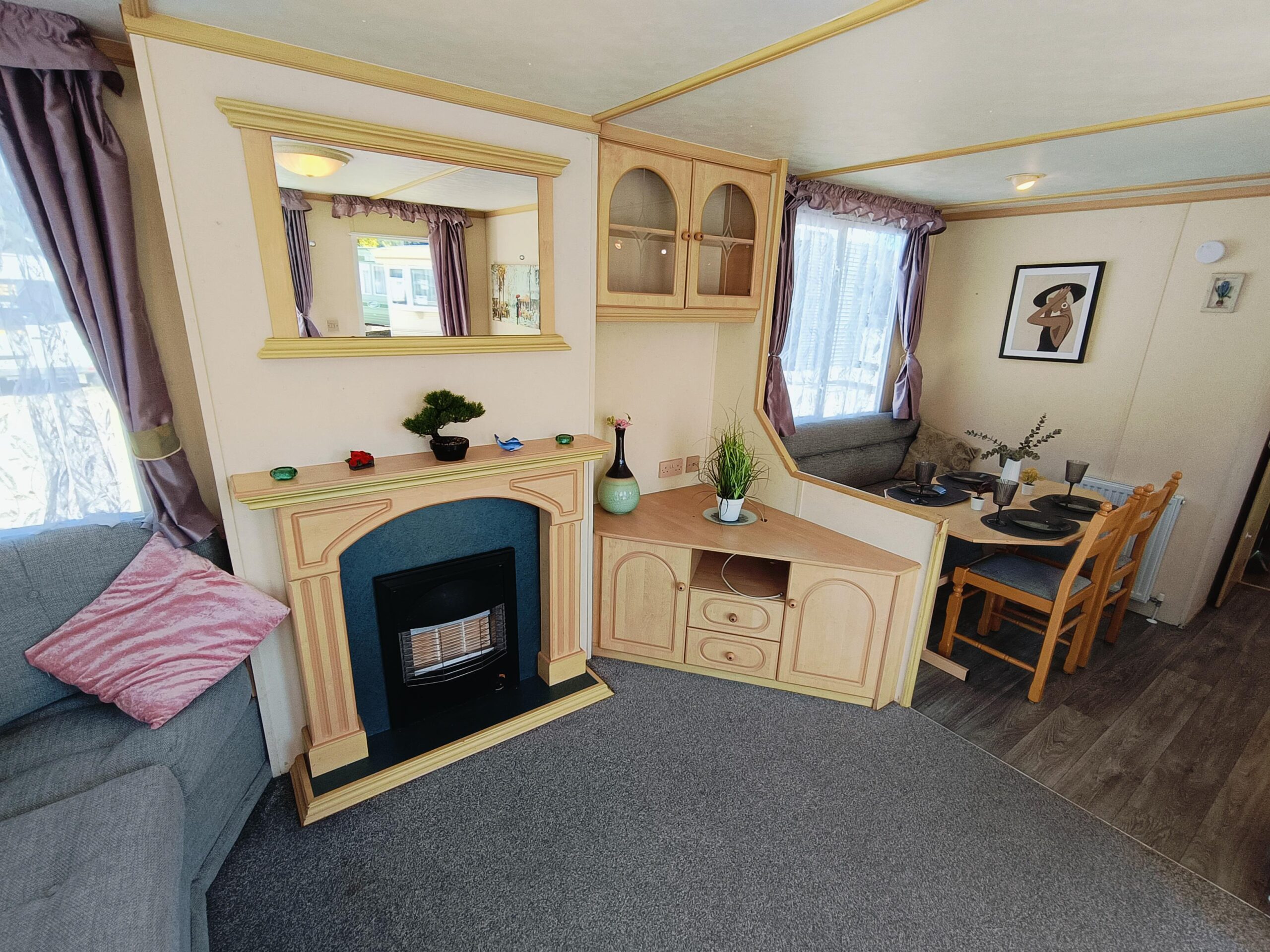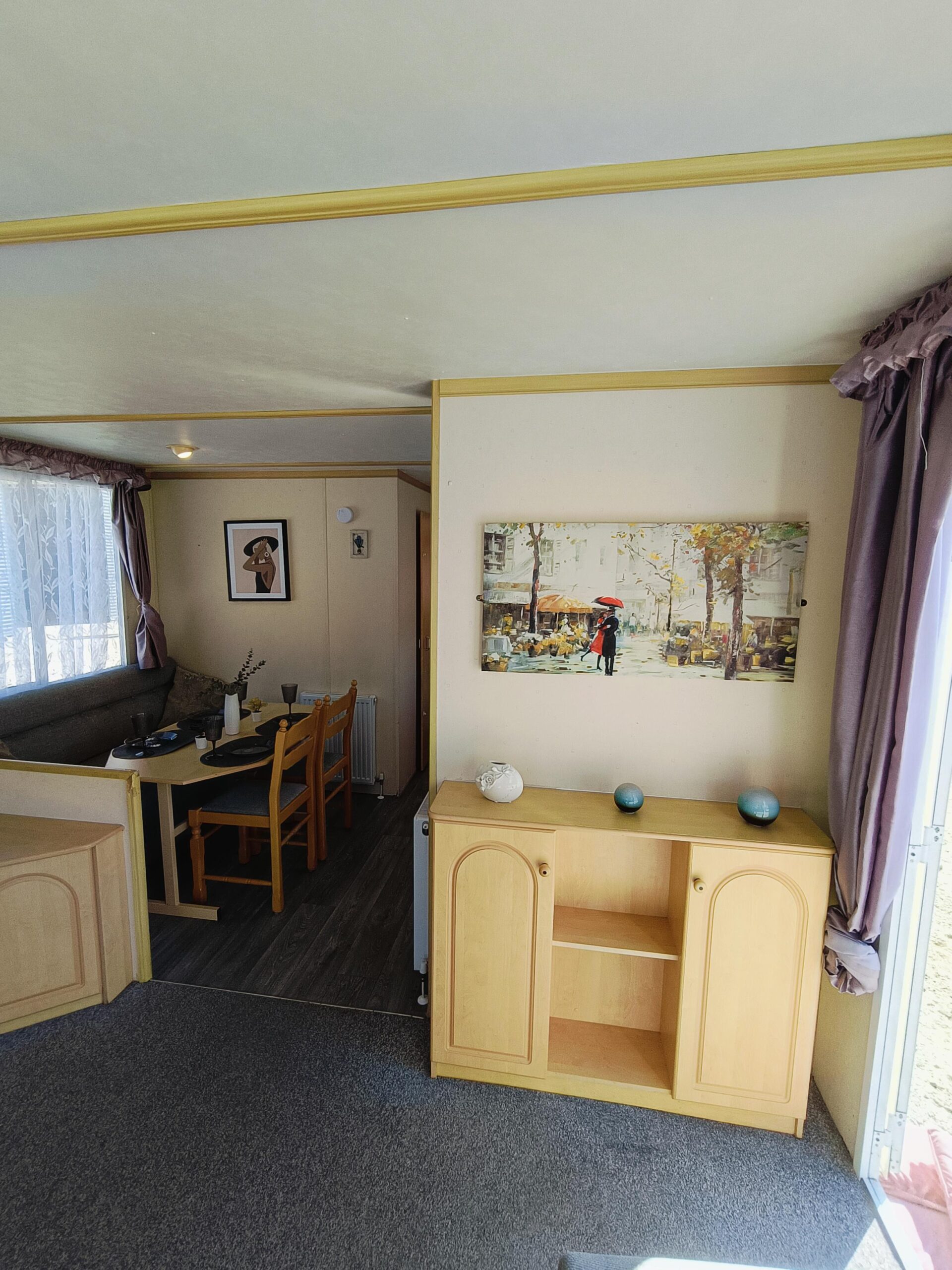 Bardzo ładny w pełni izolowany, zadbany i czysty domek angielski z drzwiami PCV przestronnym salonem, w którym znajduje się sofa, szafy, kominek, jadalnia