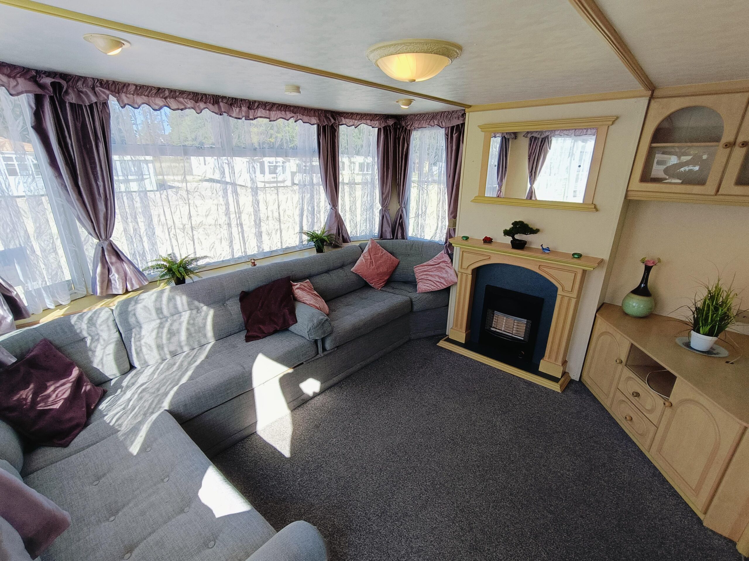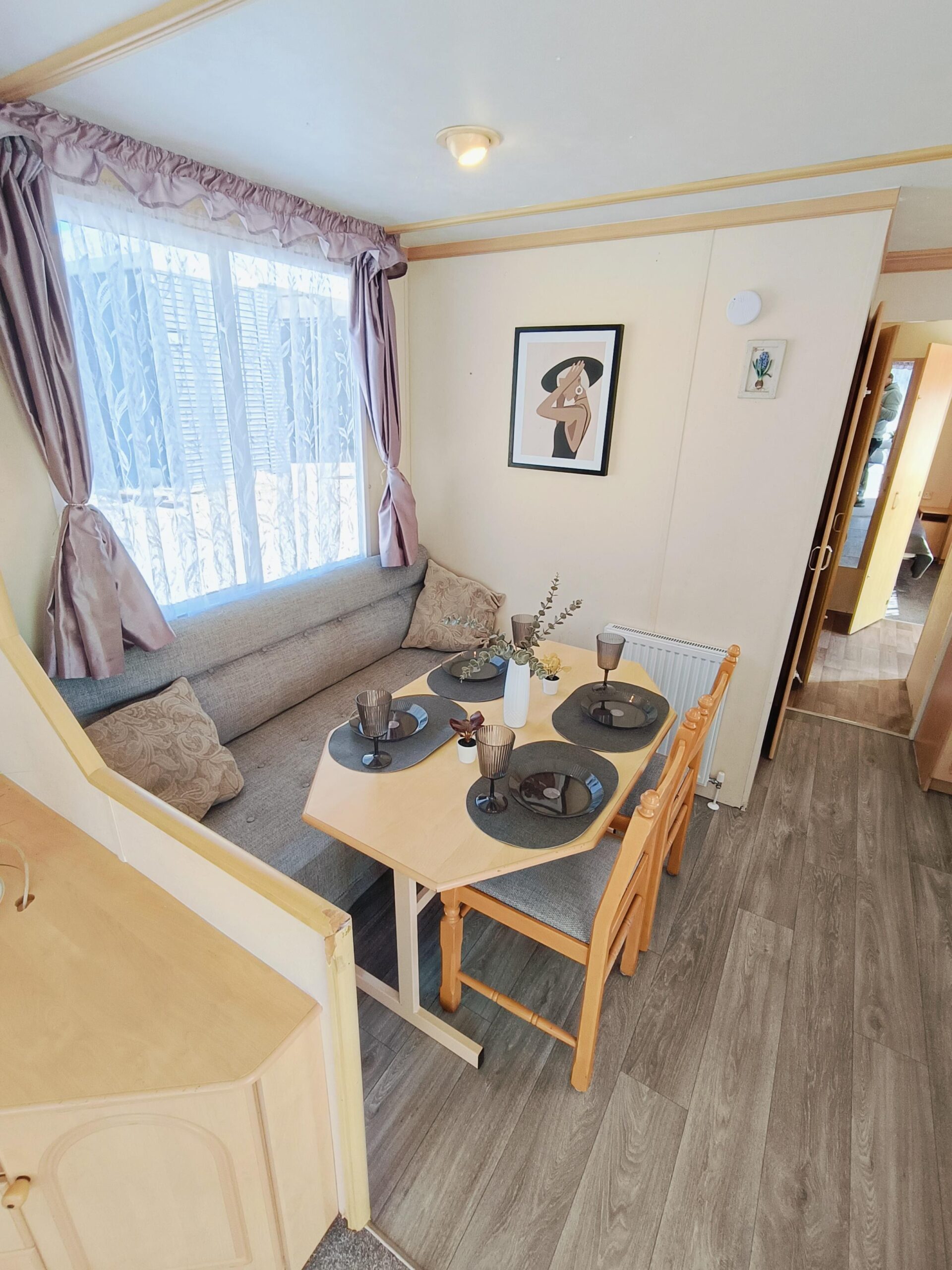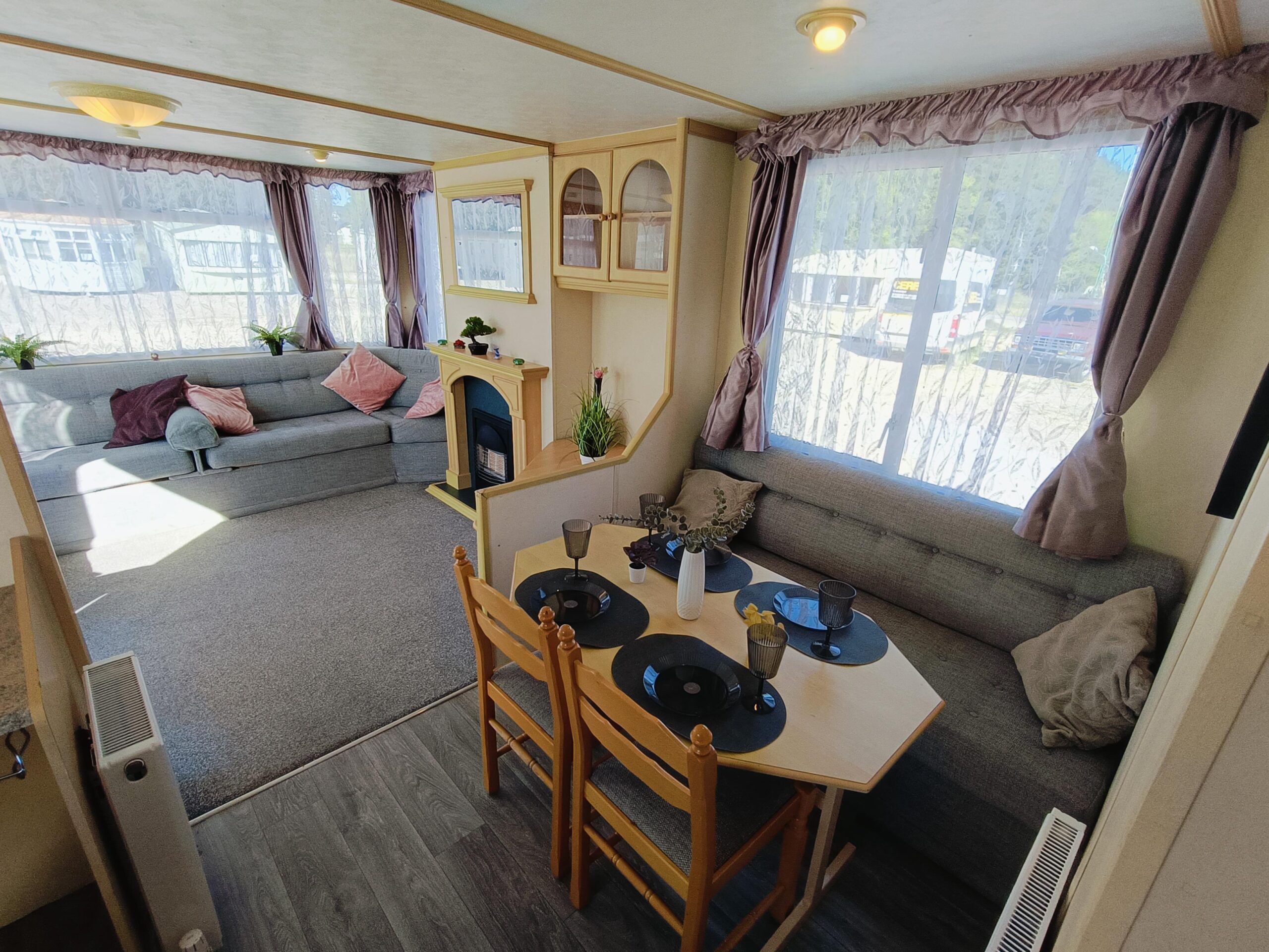 Bardzo ładny w pełni izolowany, zadbany i czysty domek angielski z drzwiami PCV przestronnym salonem, w którym znajduje się sofa, szafy, kominek, jadalnia