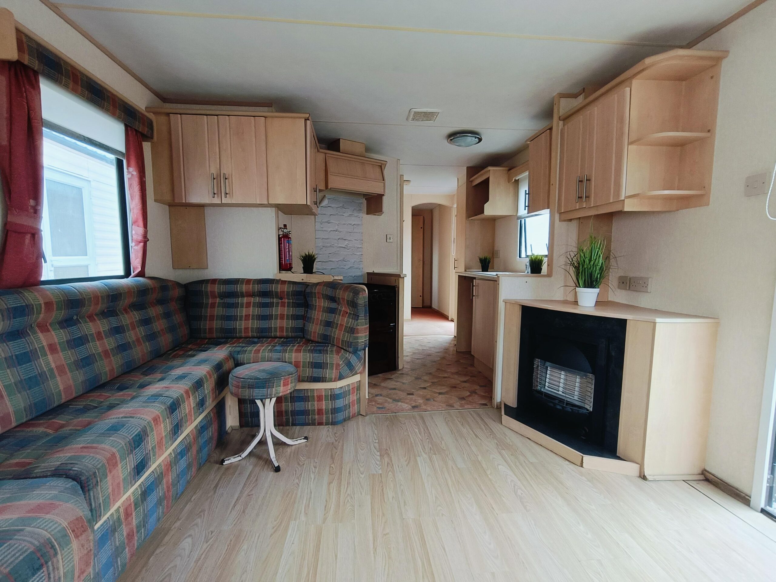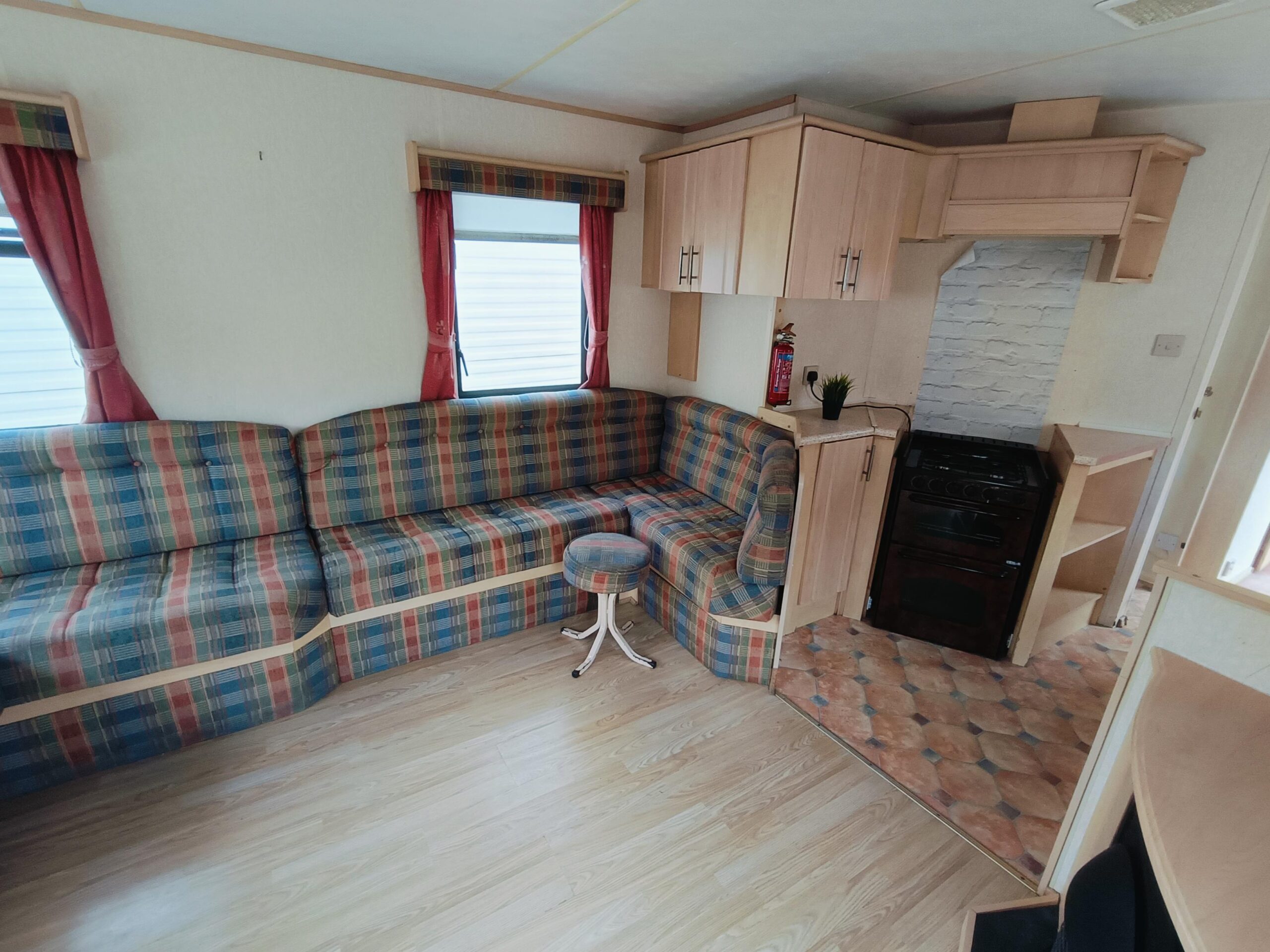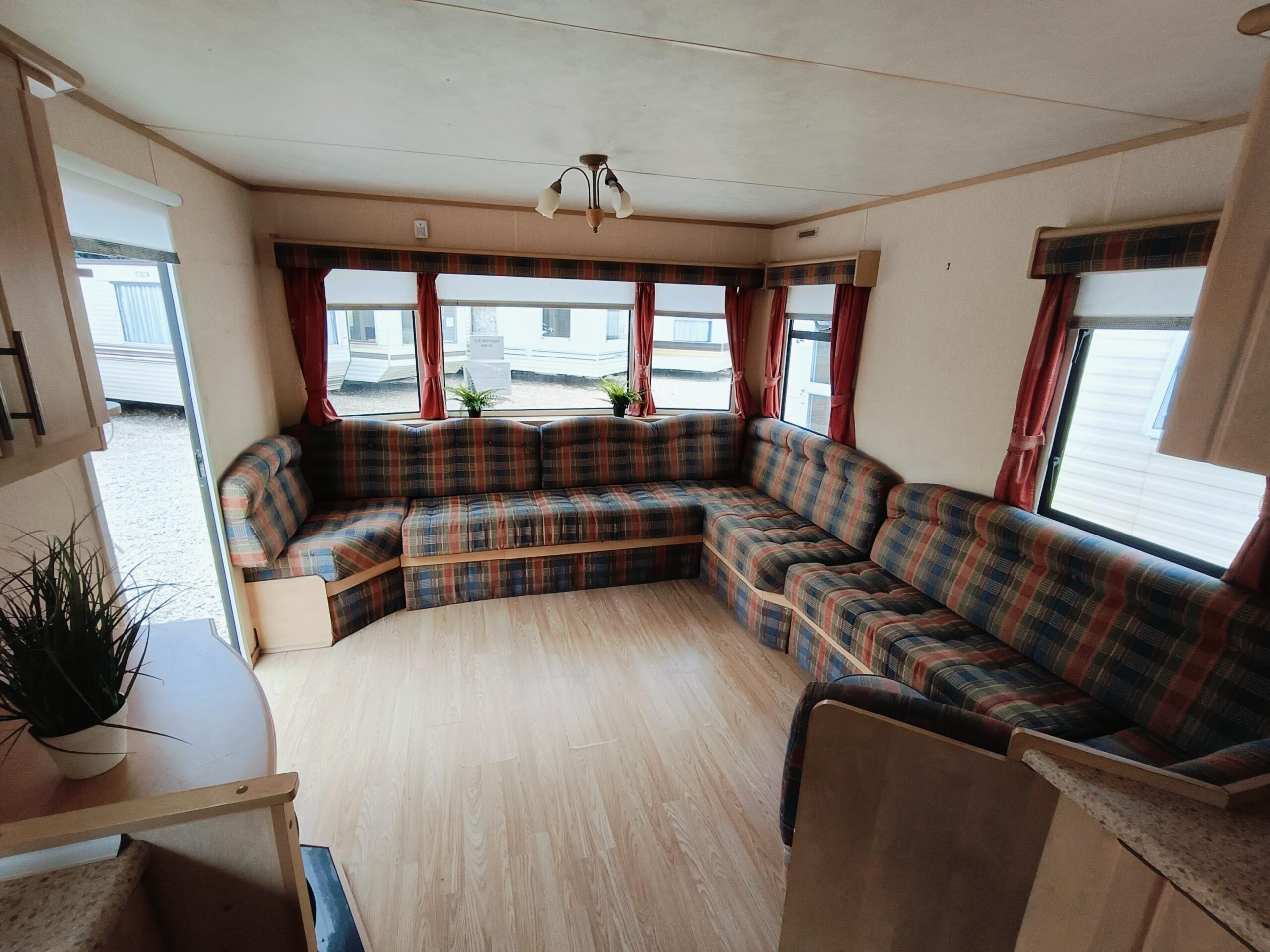 Bardzo ładny w pełni izolowany, czysty domek holenderski z drzwiami aluminium i przestronnym salonem, w którym znajduje się kominek, duża sofa, stół, stolik na TV. JADALNIA