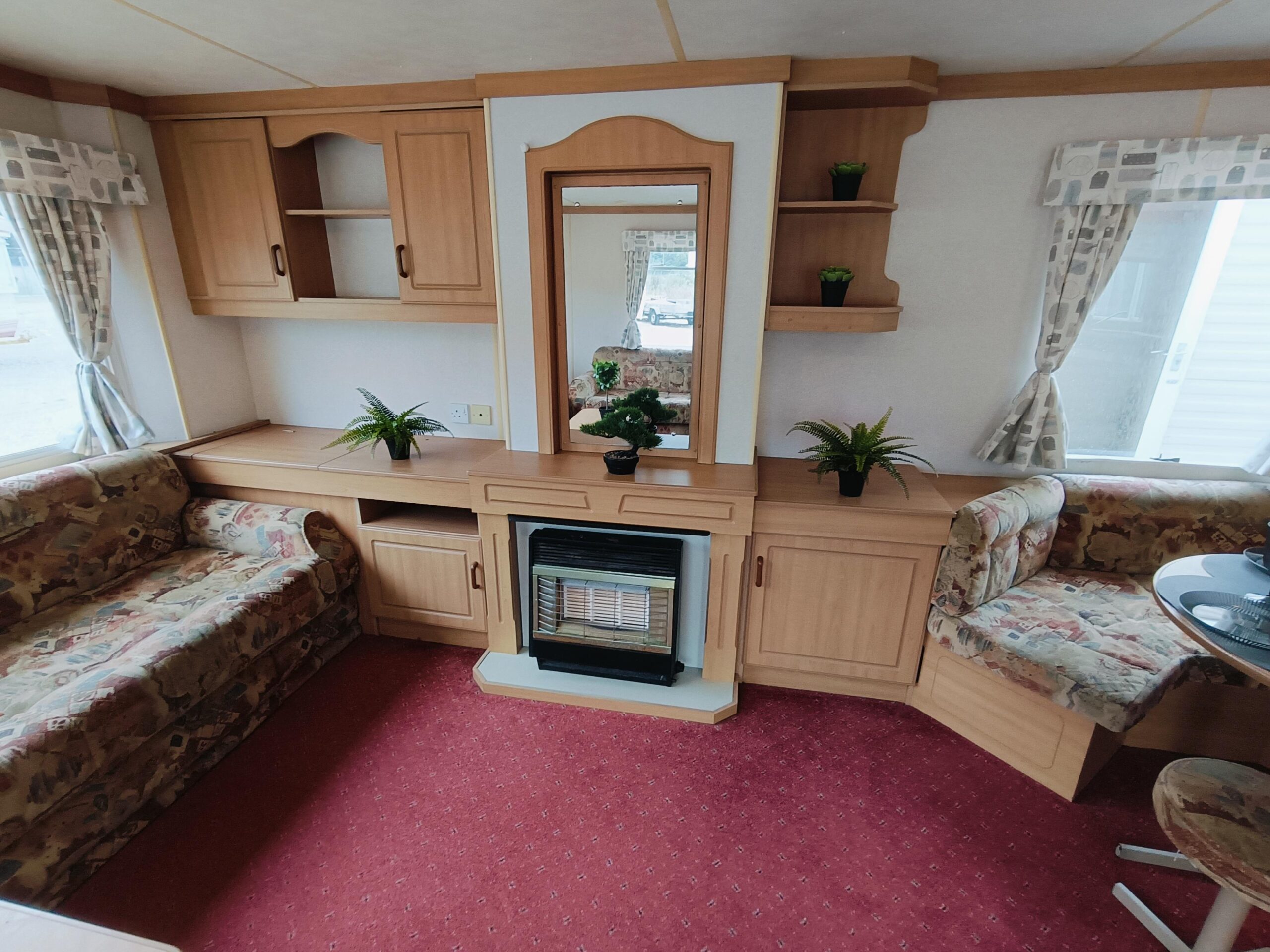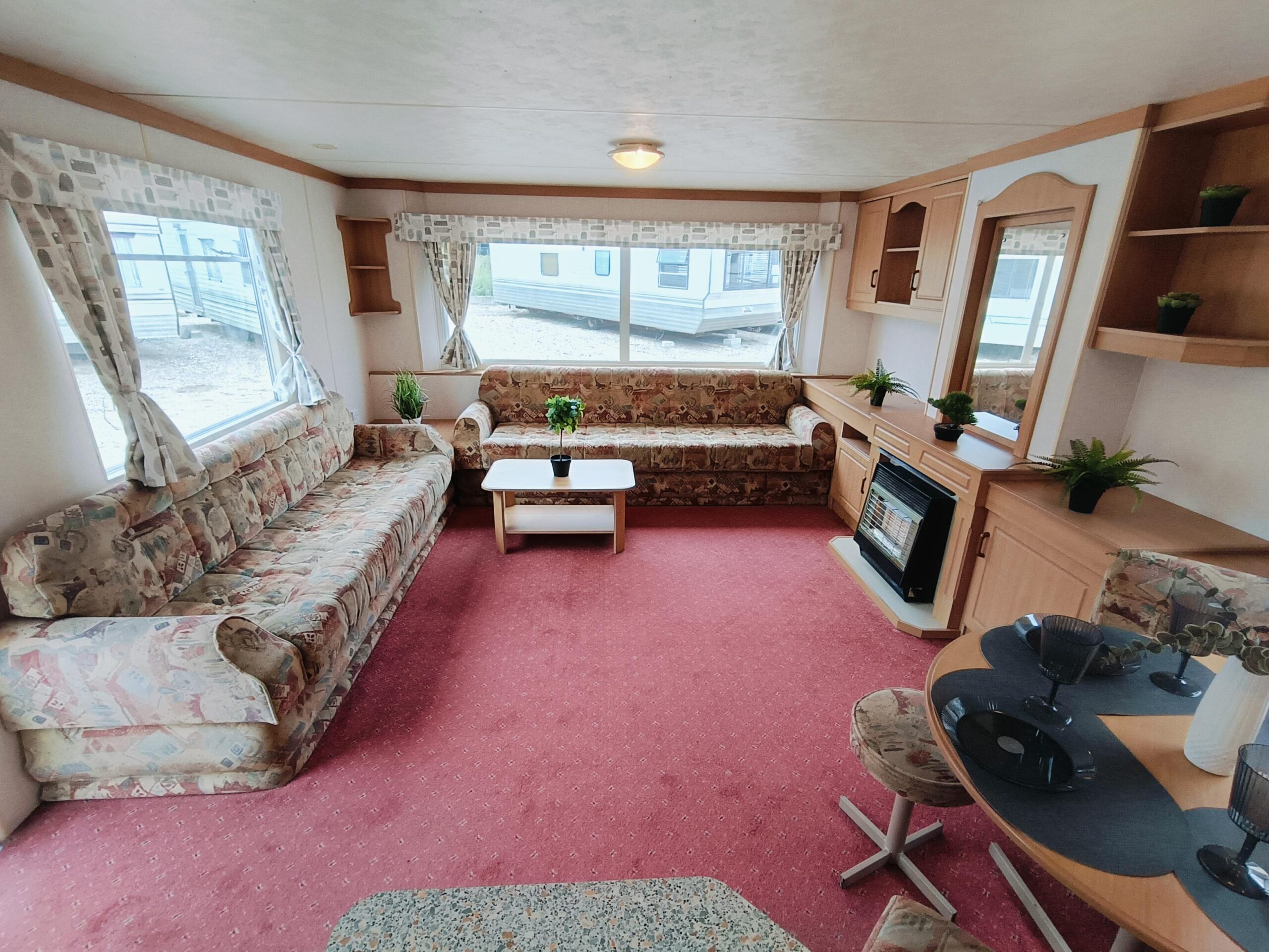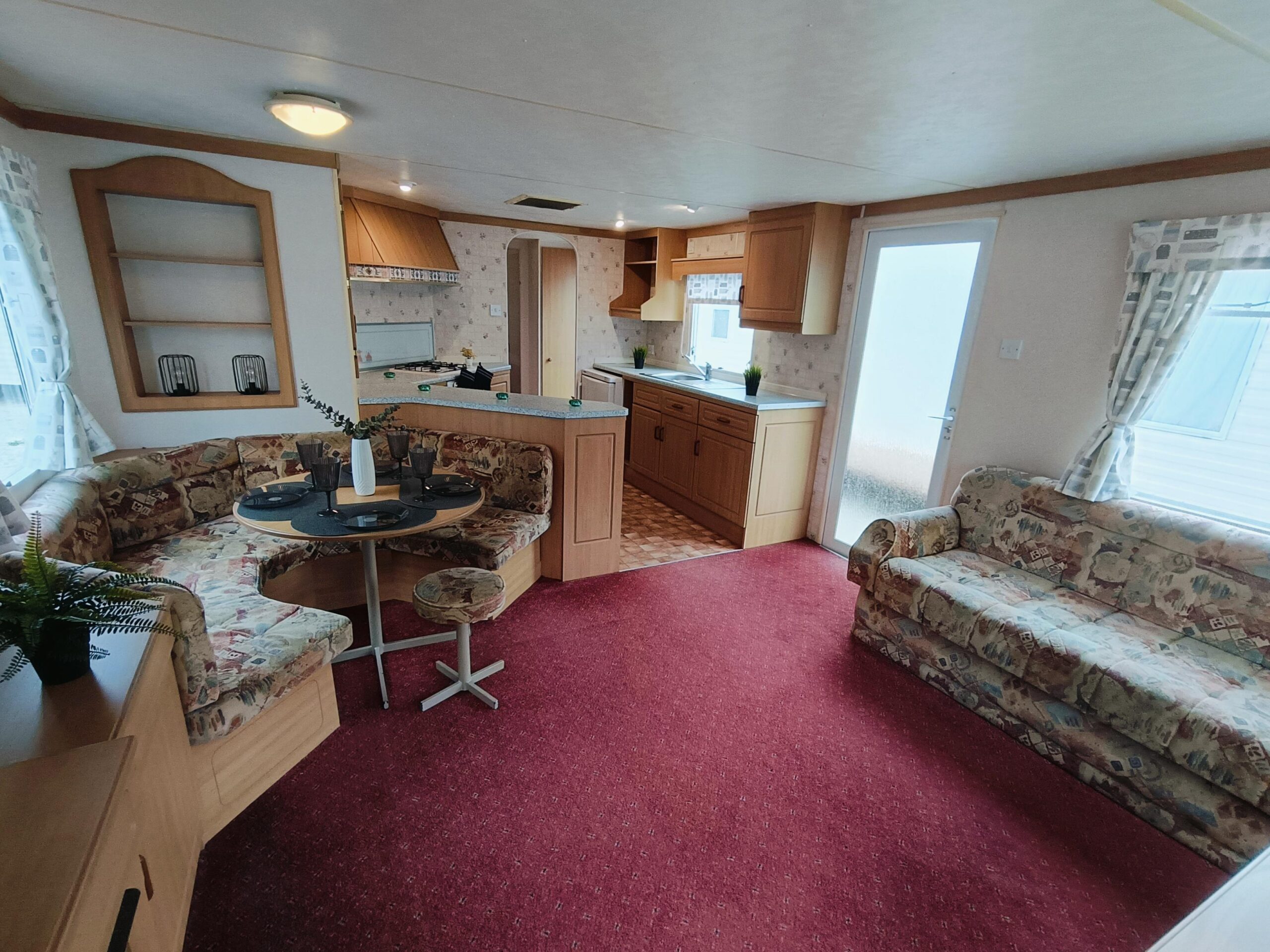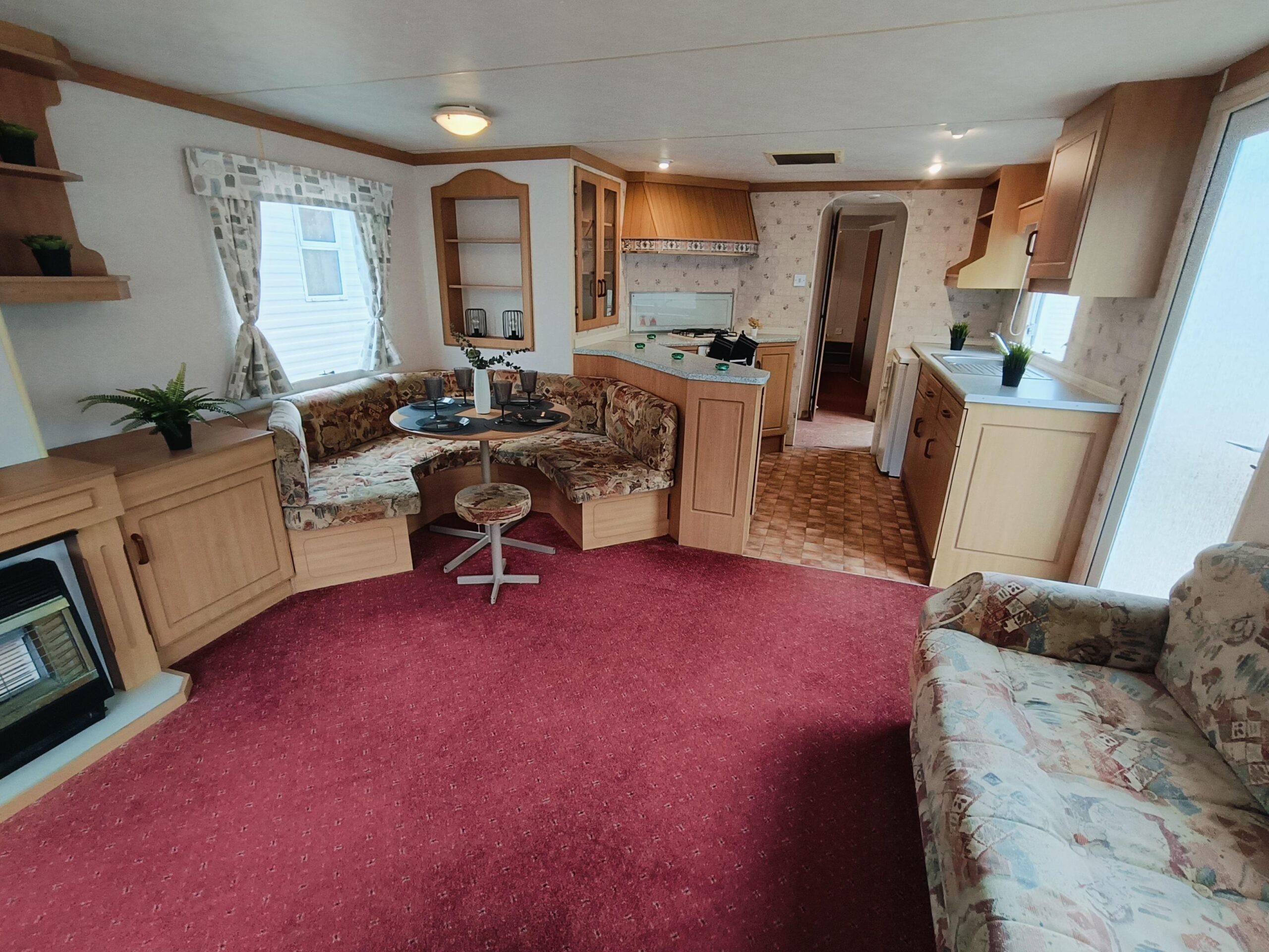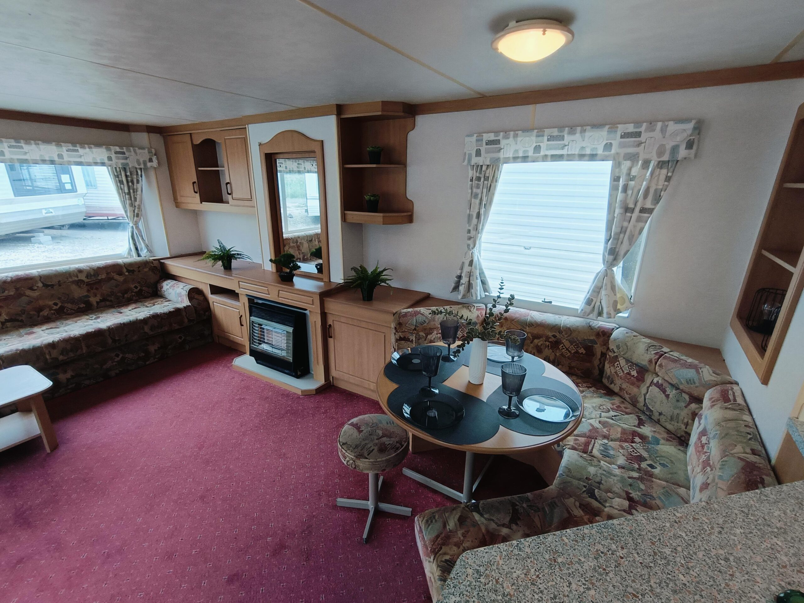 Domek EVERGLADE z drzwiami aluminium, dużym przestronnym salonem, w którym znajduje się kominek gazowy, jadalnia