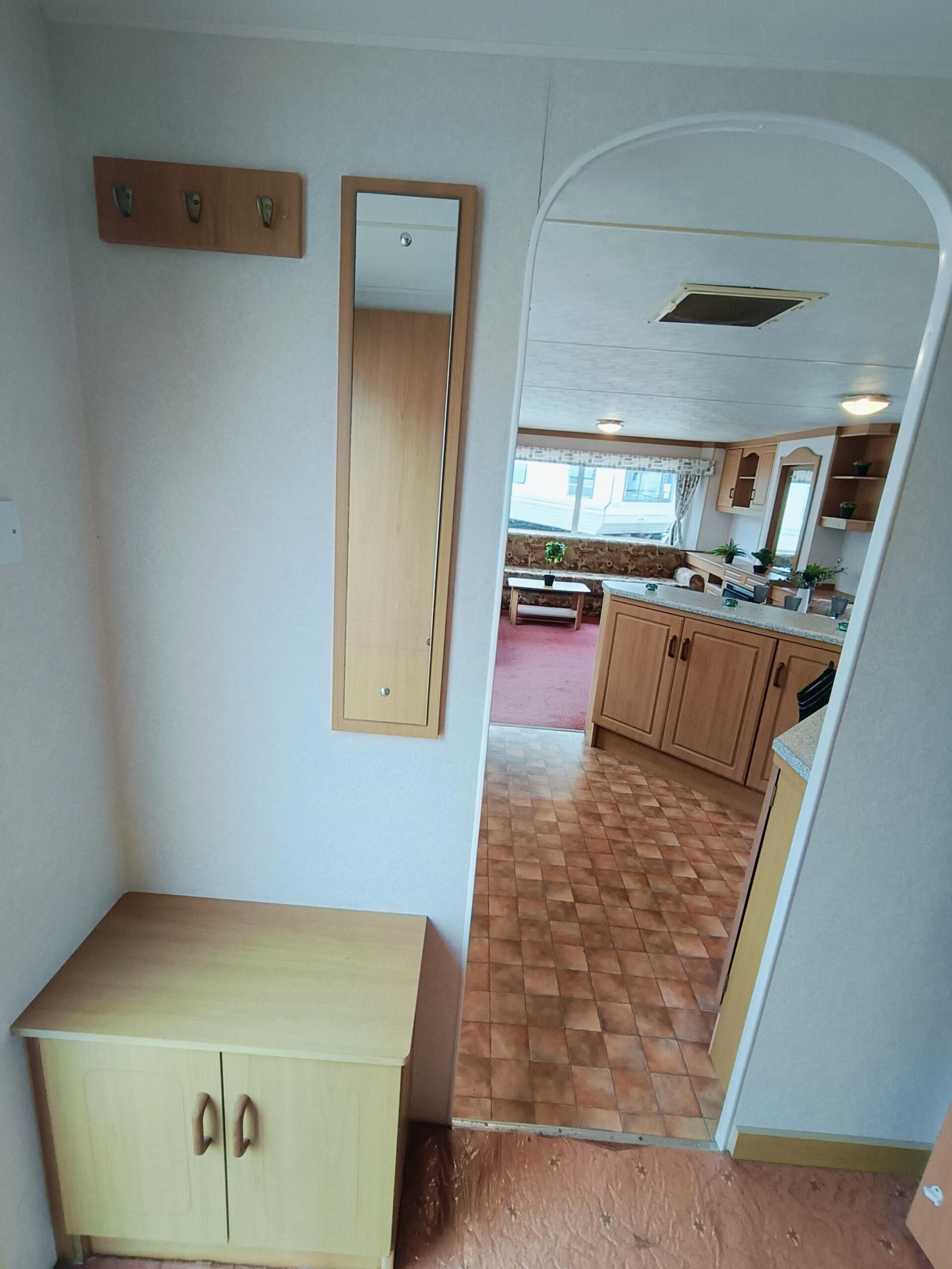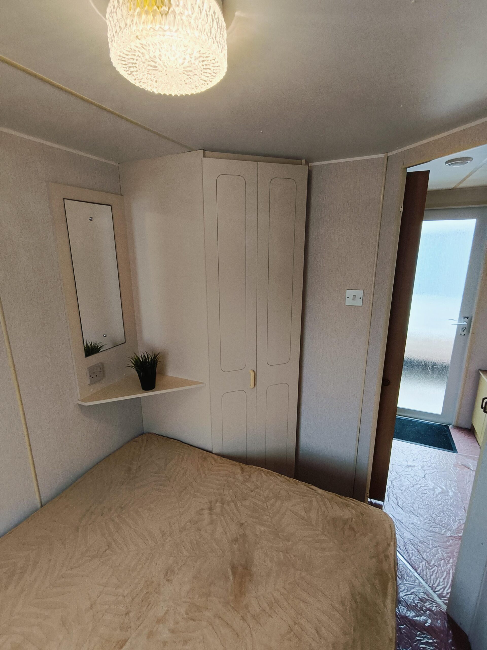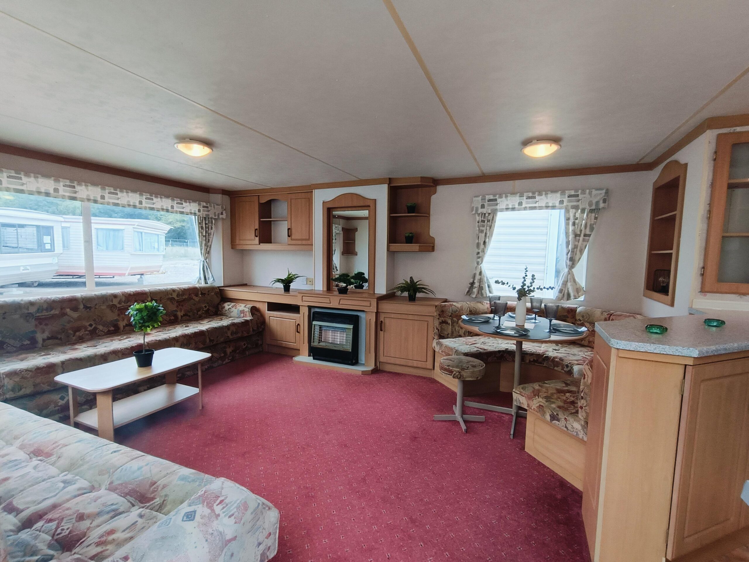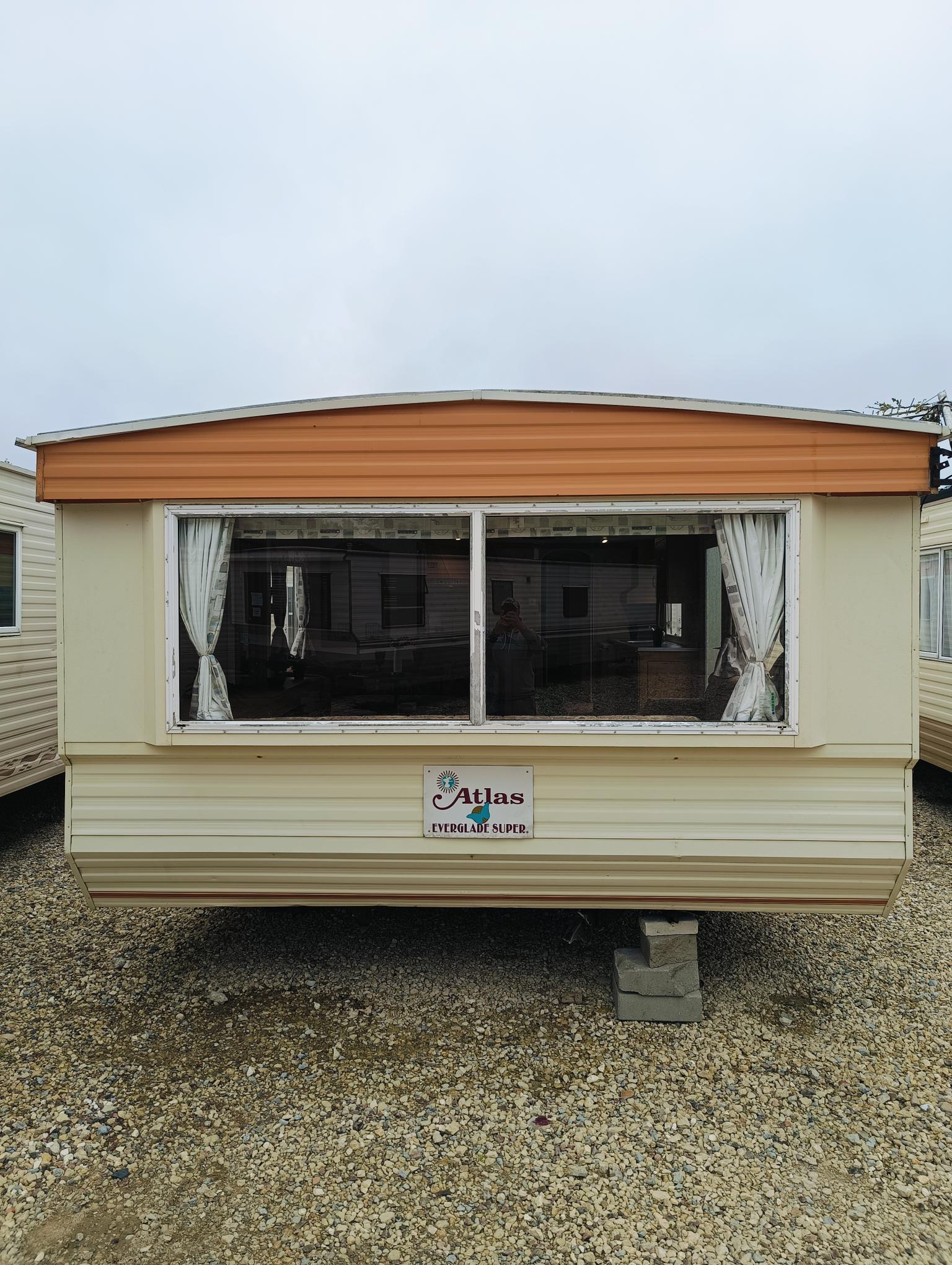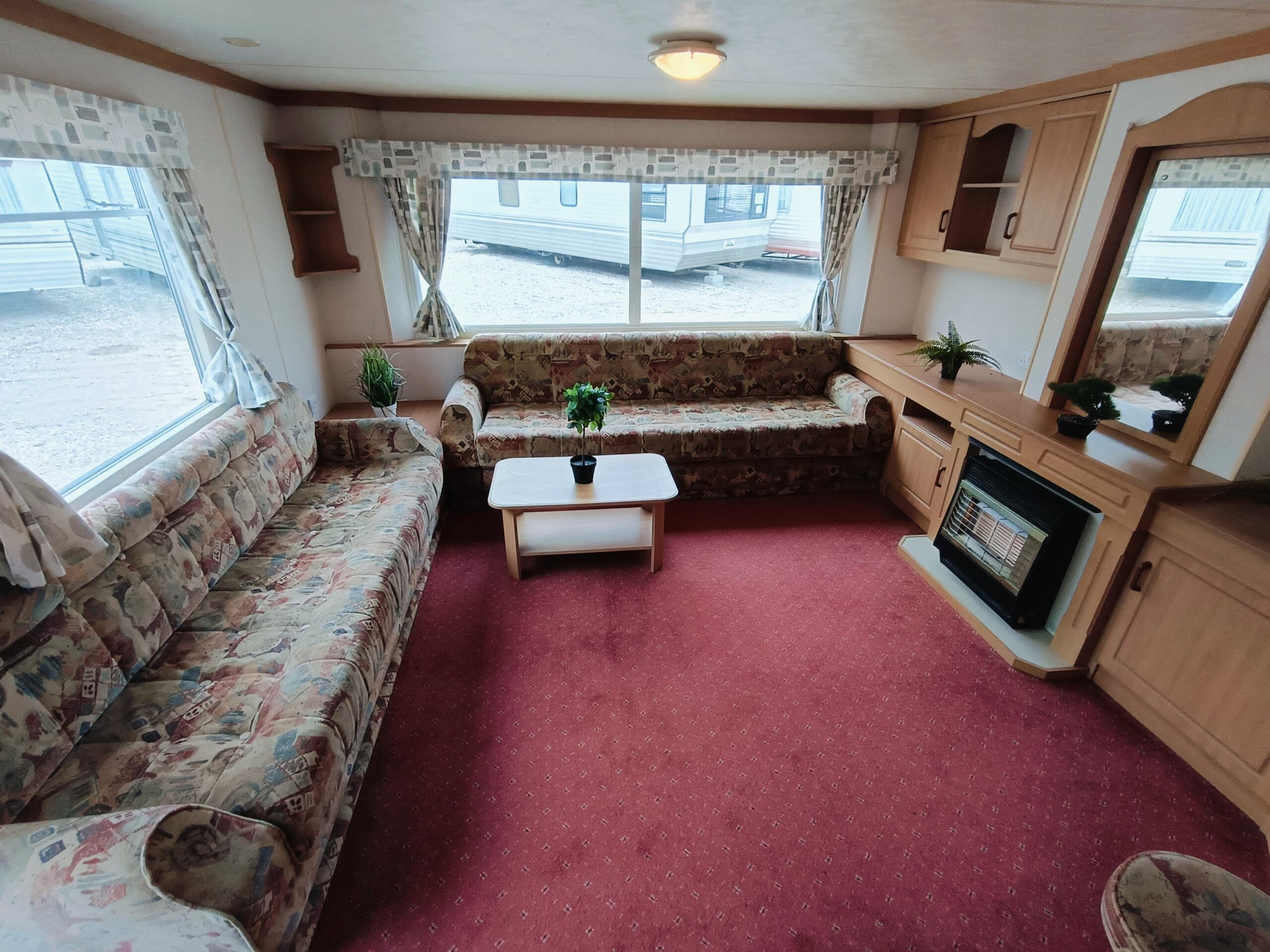 Domek EVERGLADE z drzwiami aluminium, dużym przestronnym salonem, w którym znajduje się kominek gazowy, jadalnia