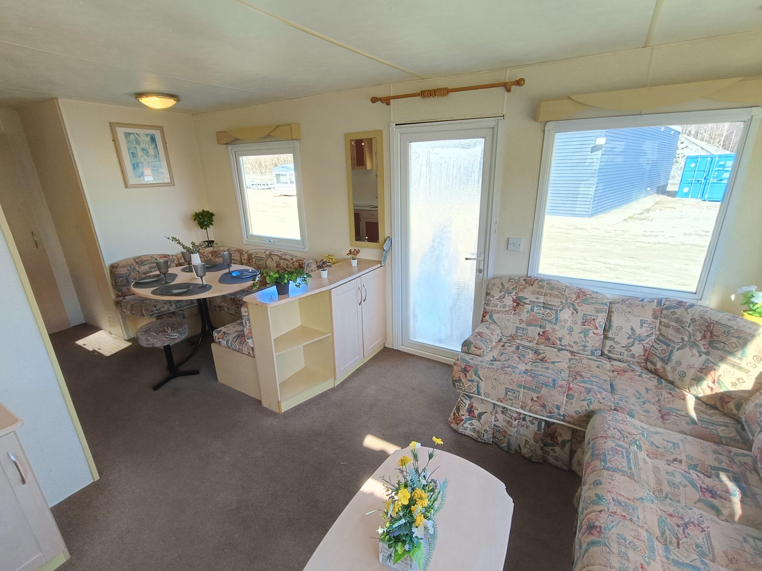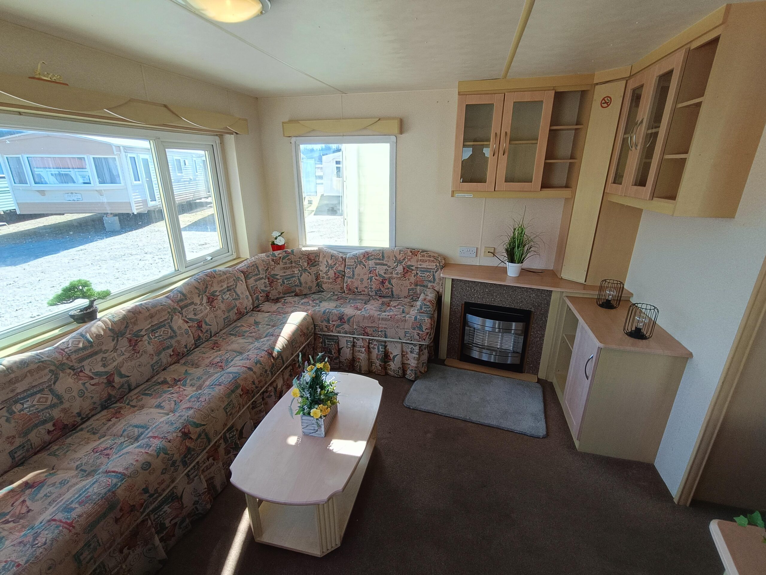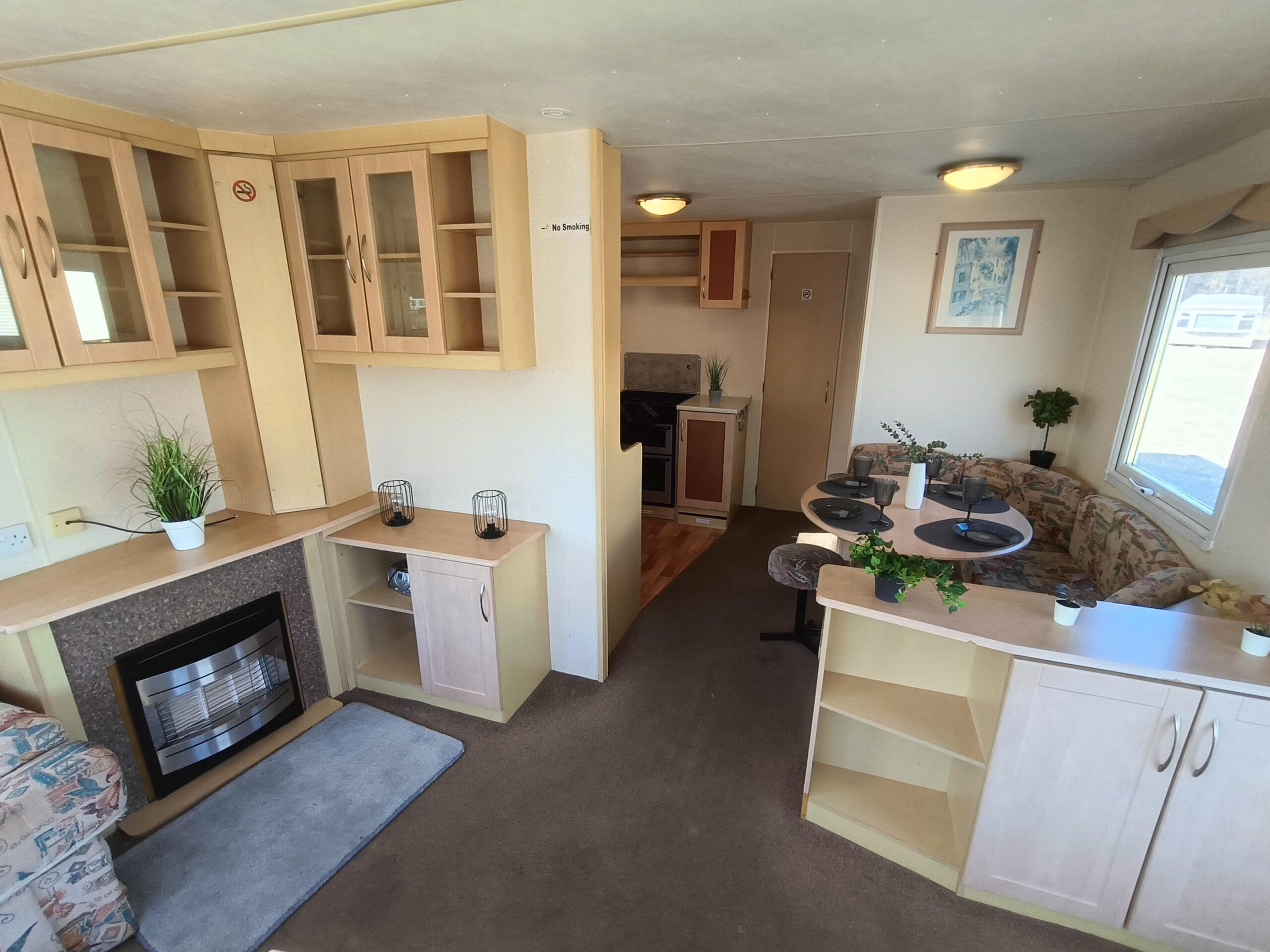 Domek CAŁOROCZNY drzwiami PCV i dużym przestronnym salonem, w którym znajduje się kominek gazowy i wygodna sofa.