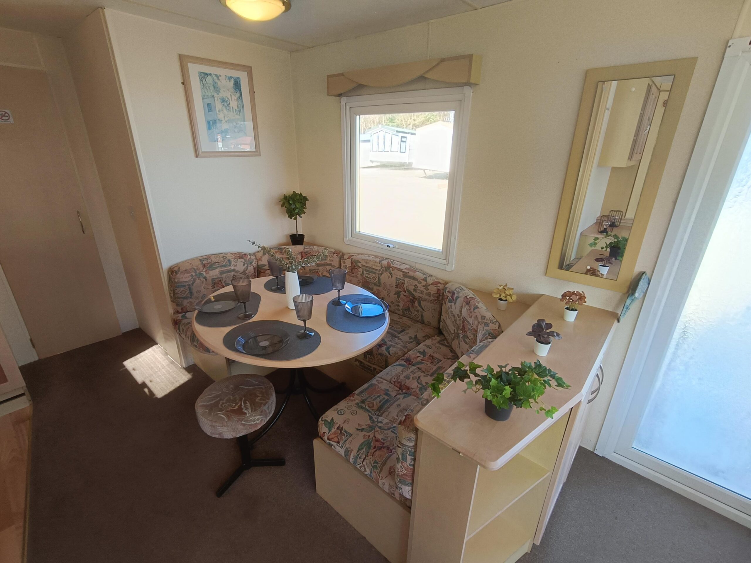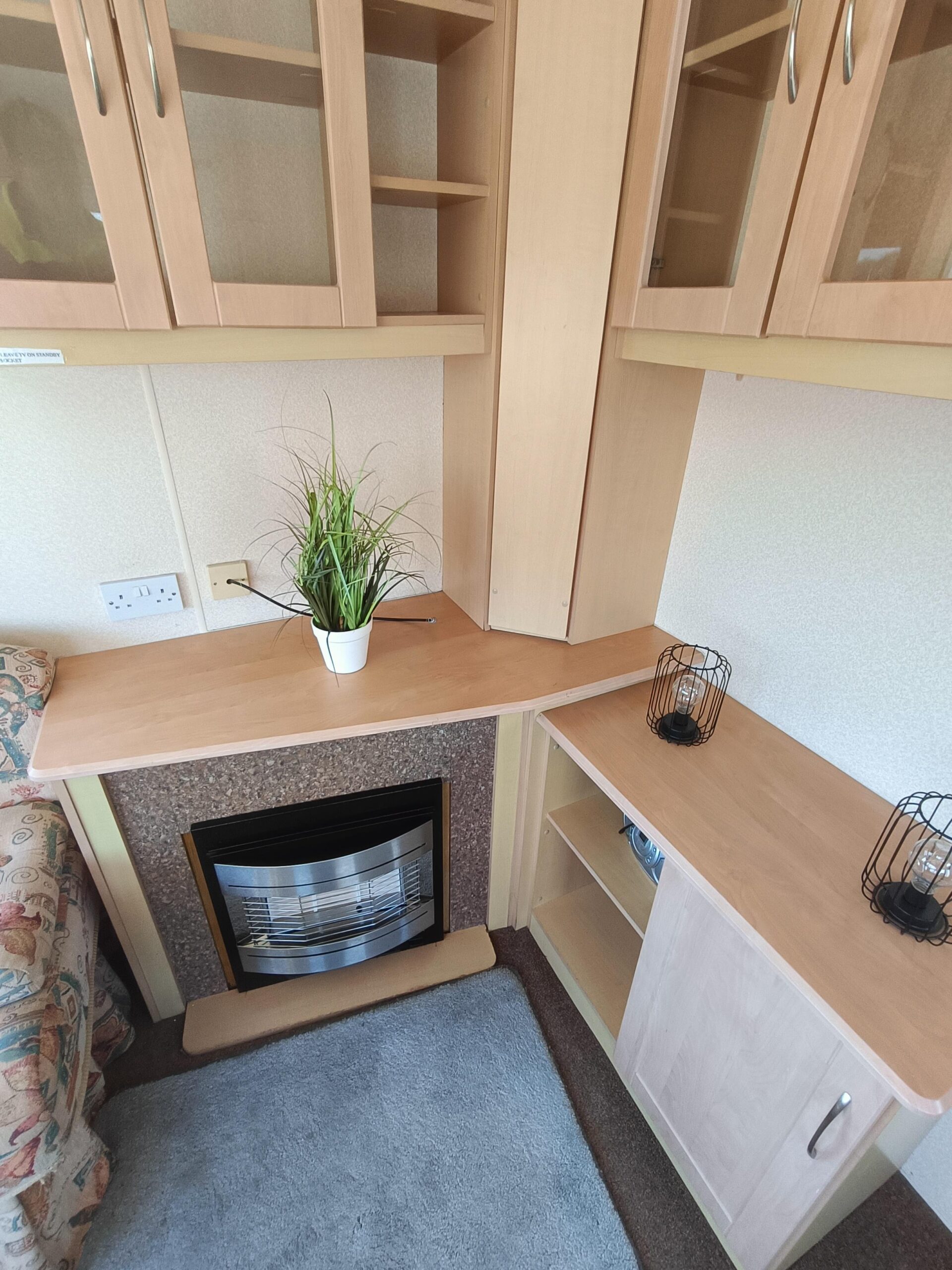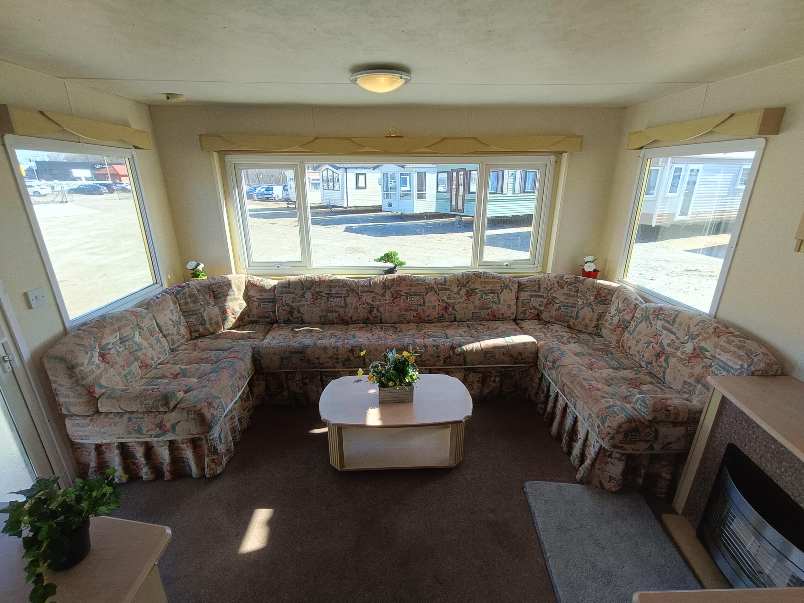 Domek CAŁOROCZNY drzwiami PCV i dużym przestronnym salonem, w którym znajduje się kominek gazowy i wygodna sofa.