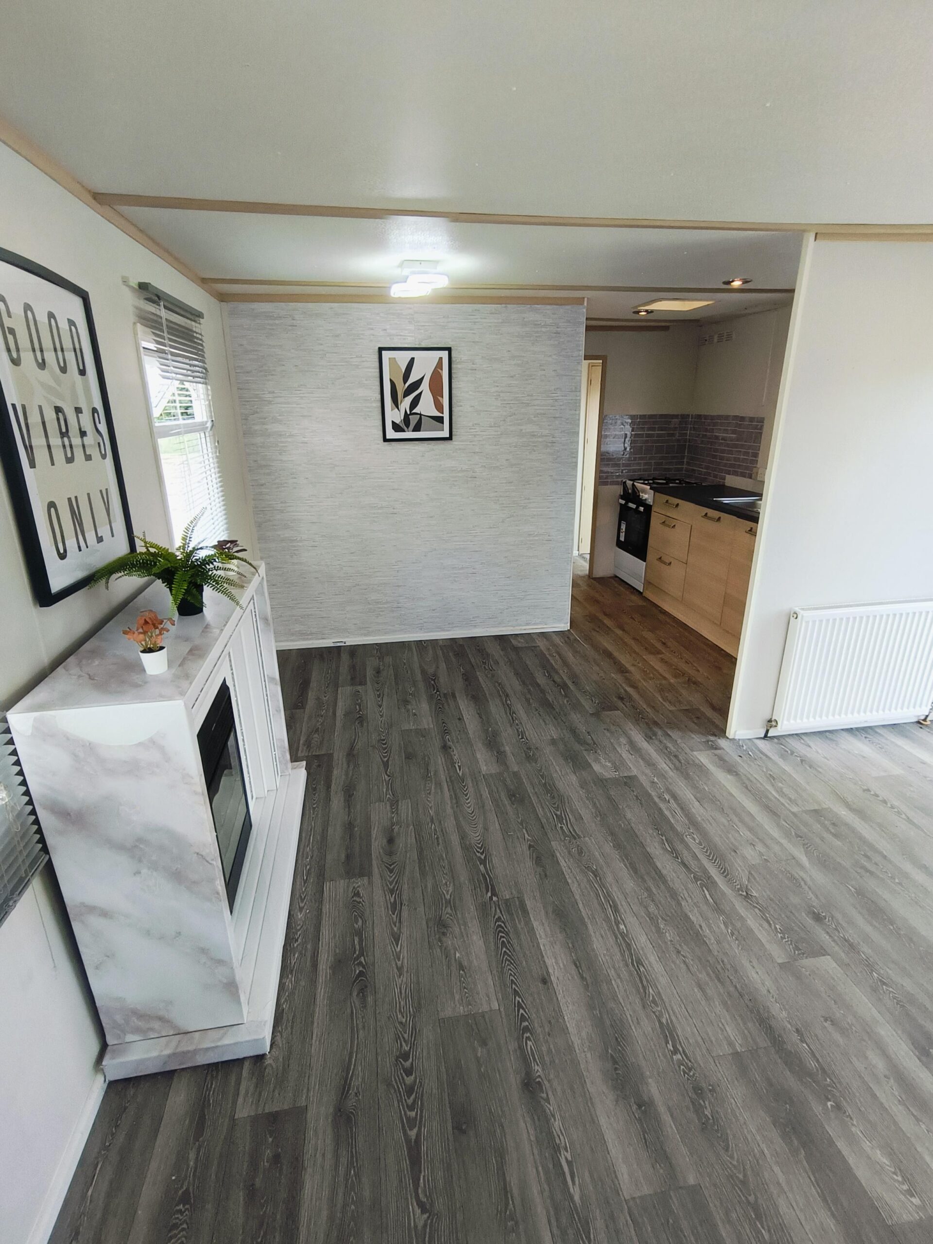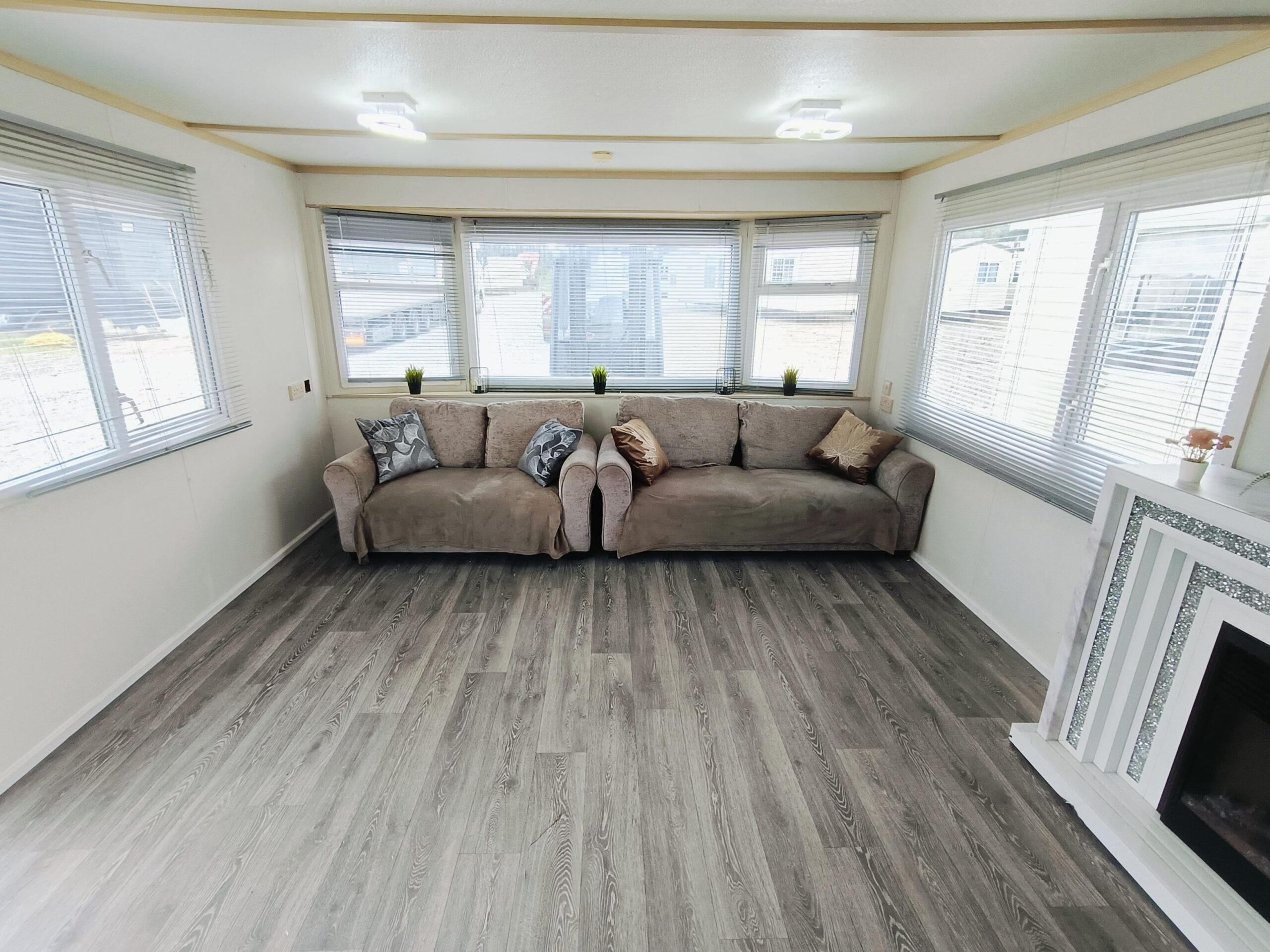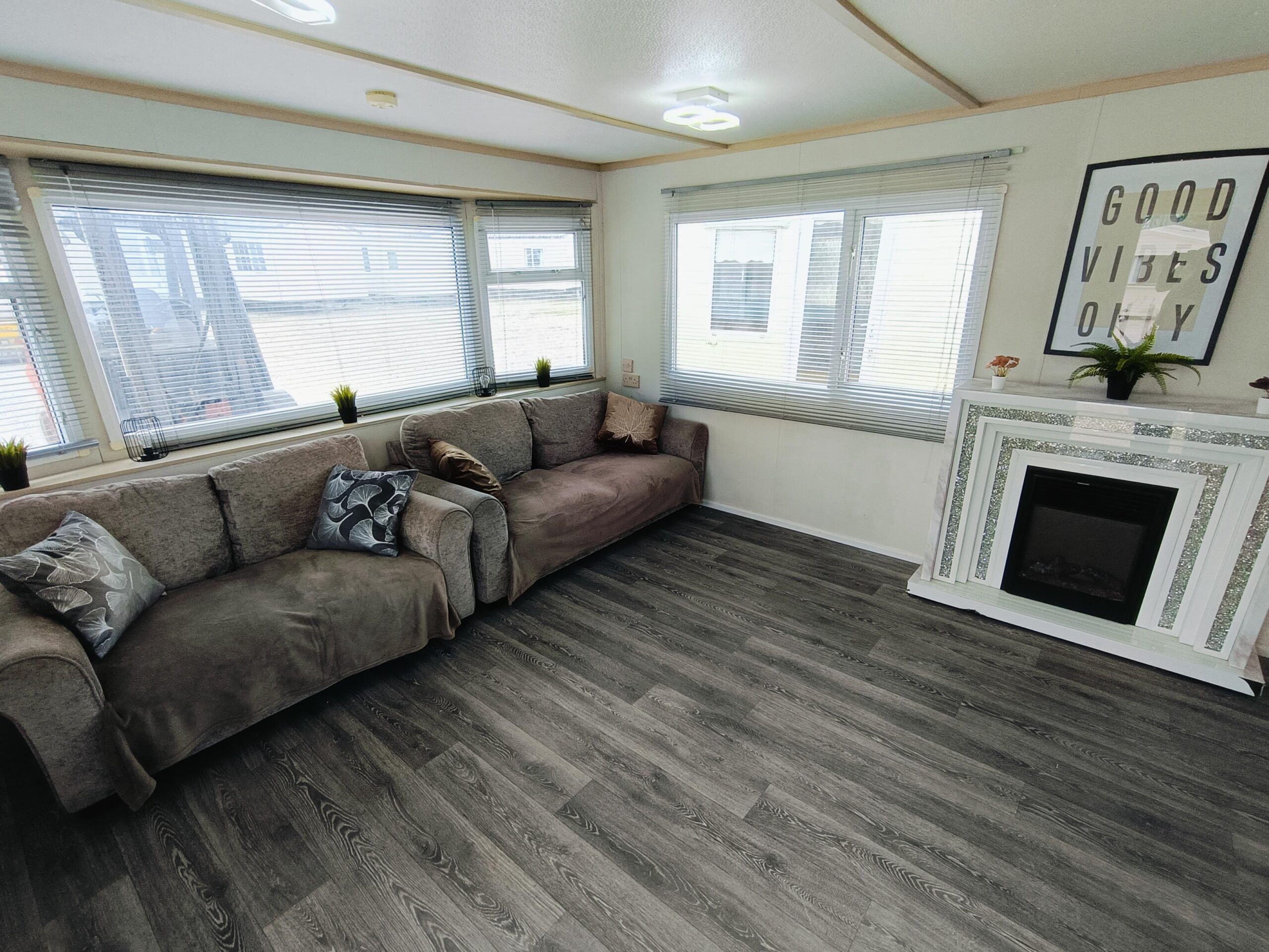 Domek CAŁOROCZNY drzwiami PCV i dużym przestronnym salonem, w którym znajduje się kominek elektryczny i wygodna sofa.