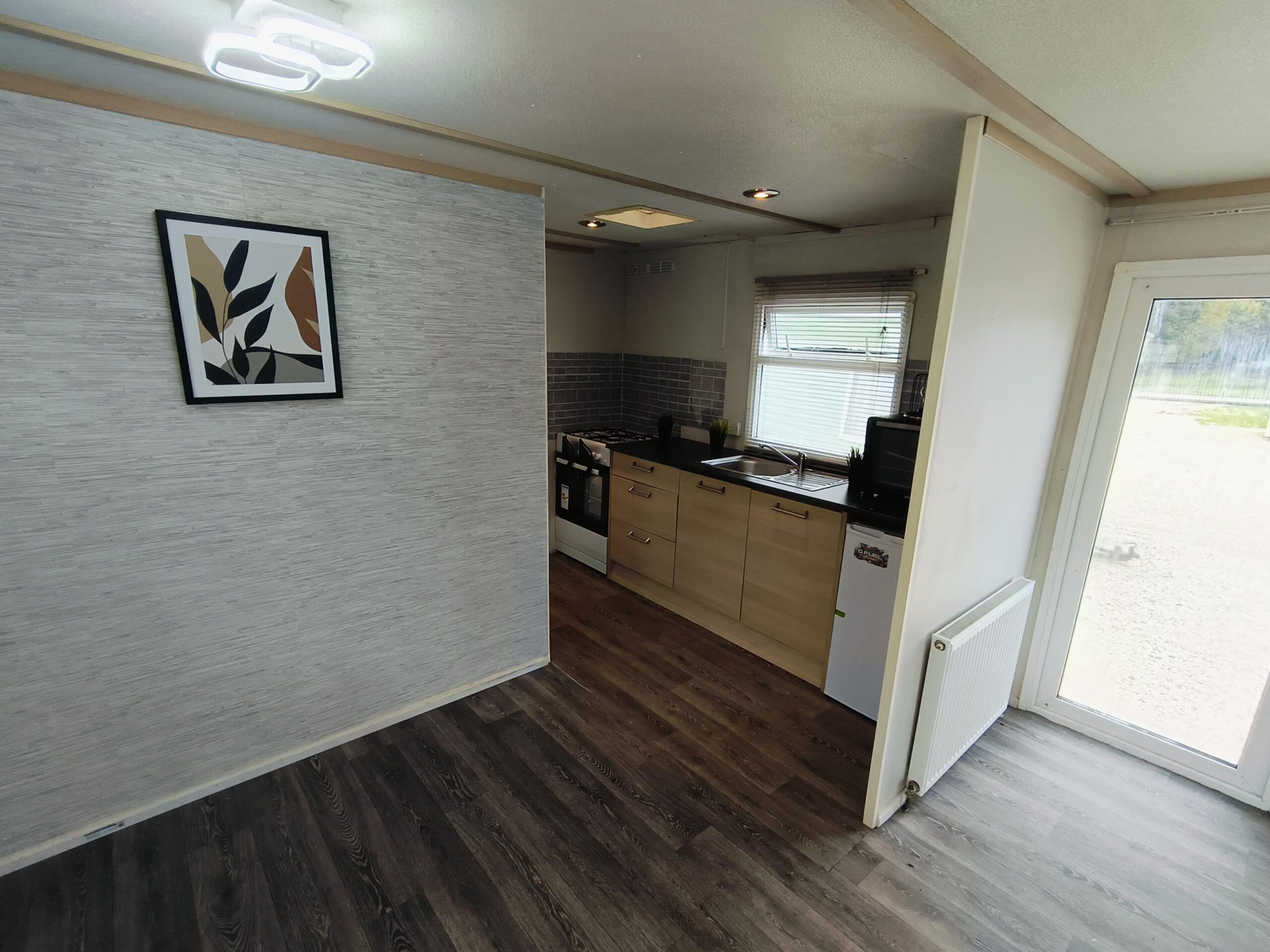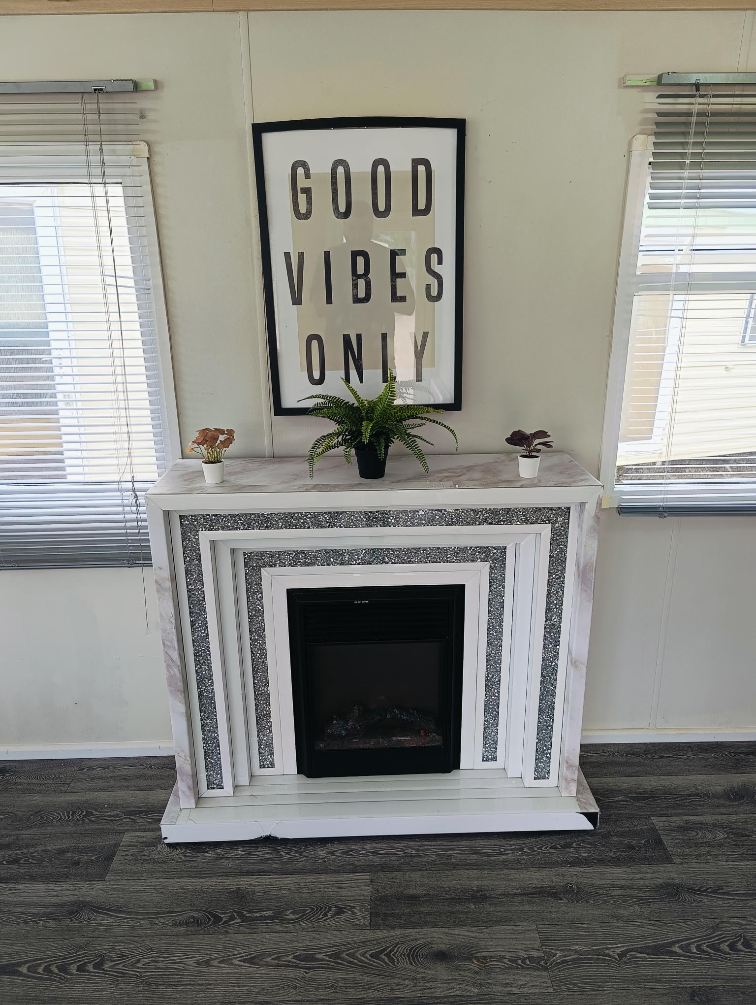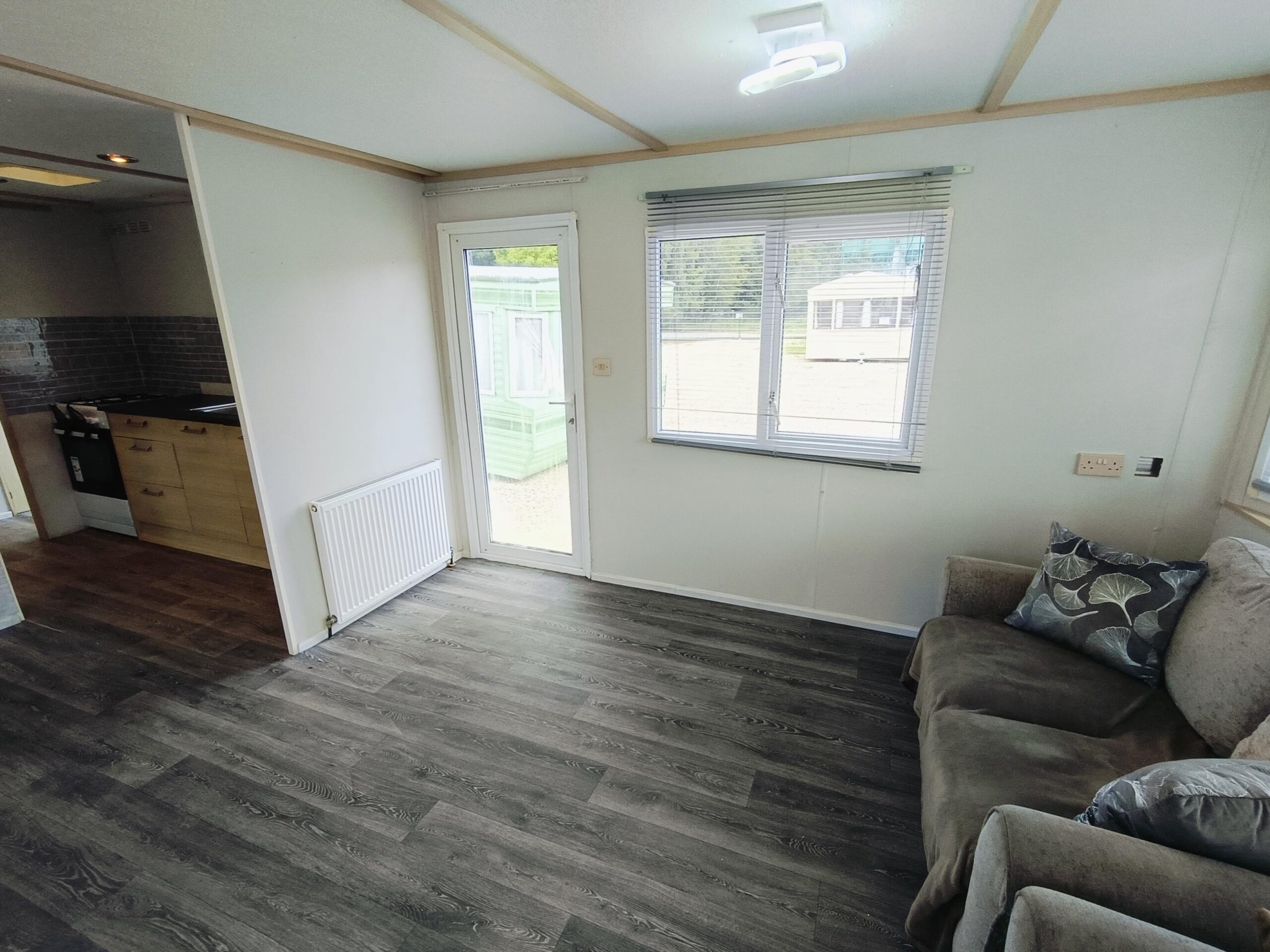 Domek CAŁOROCZNY drzwiami PCV i dużym przestronnym salonem, w którym znajduje się kominek elektryczny i wygodna sofa.