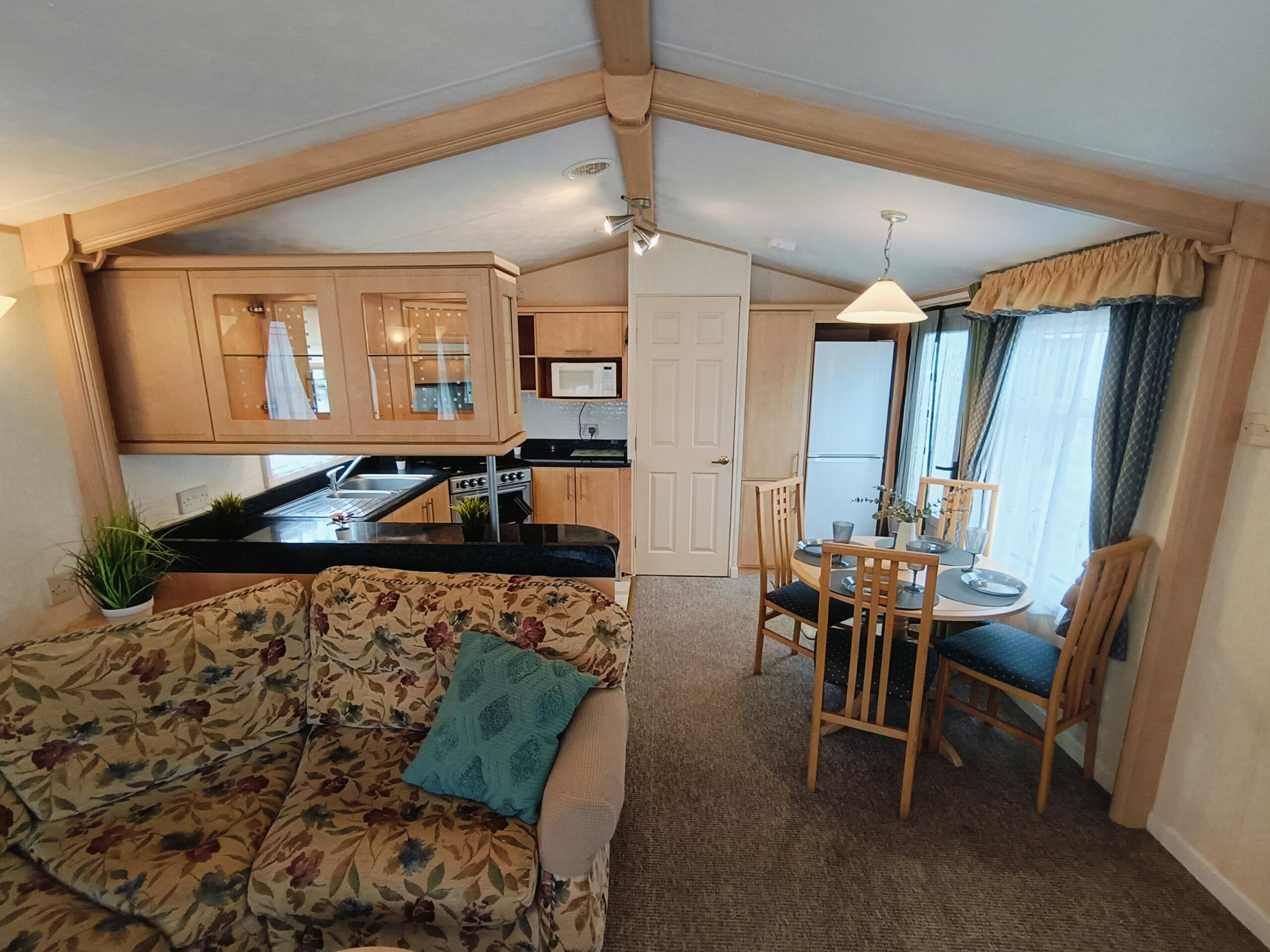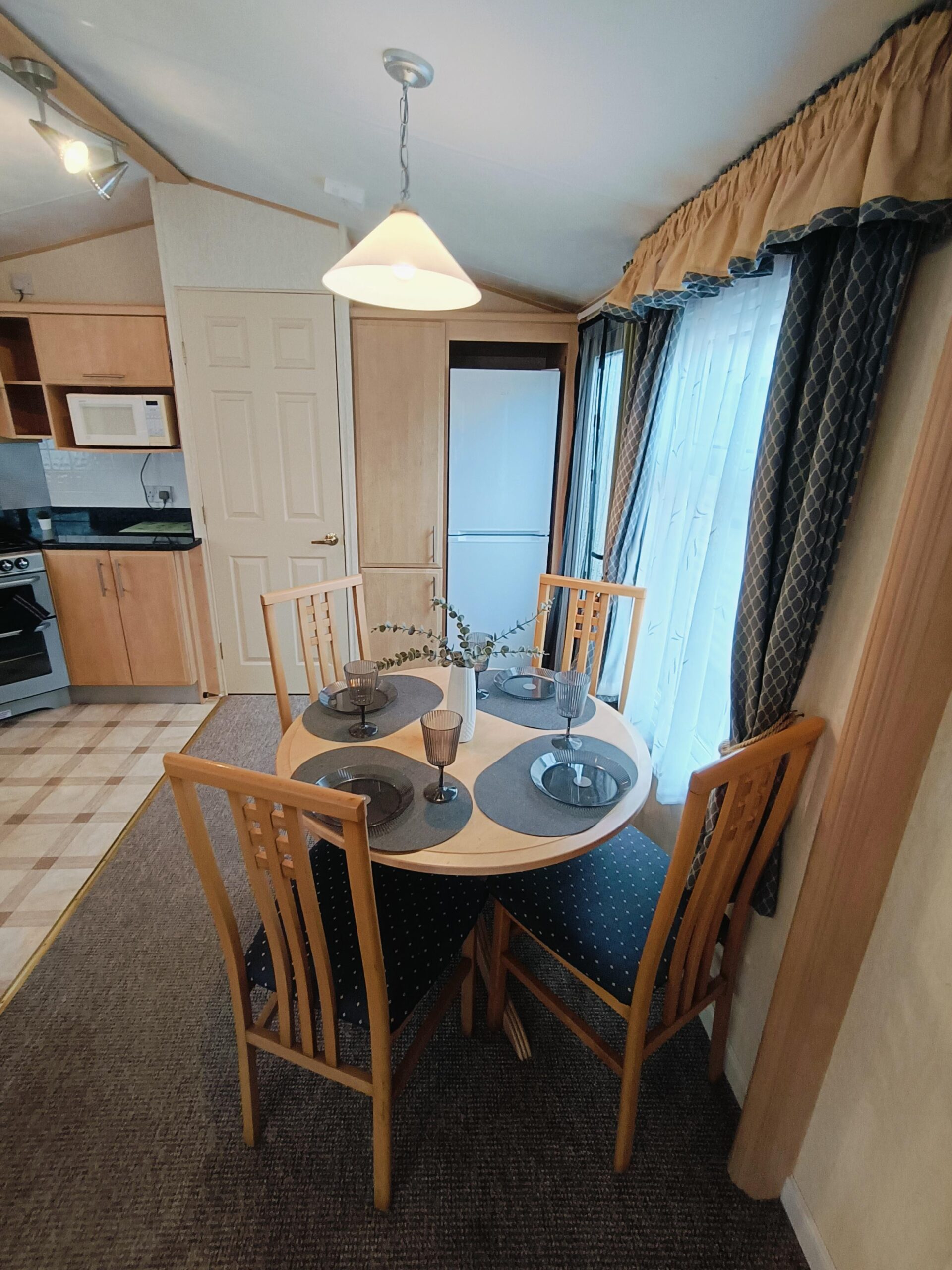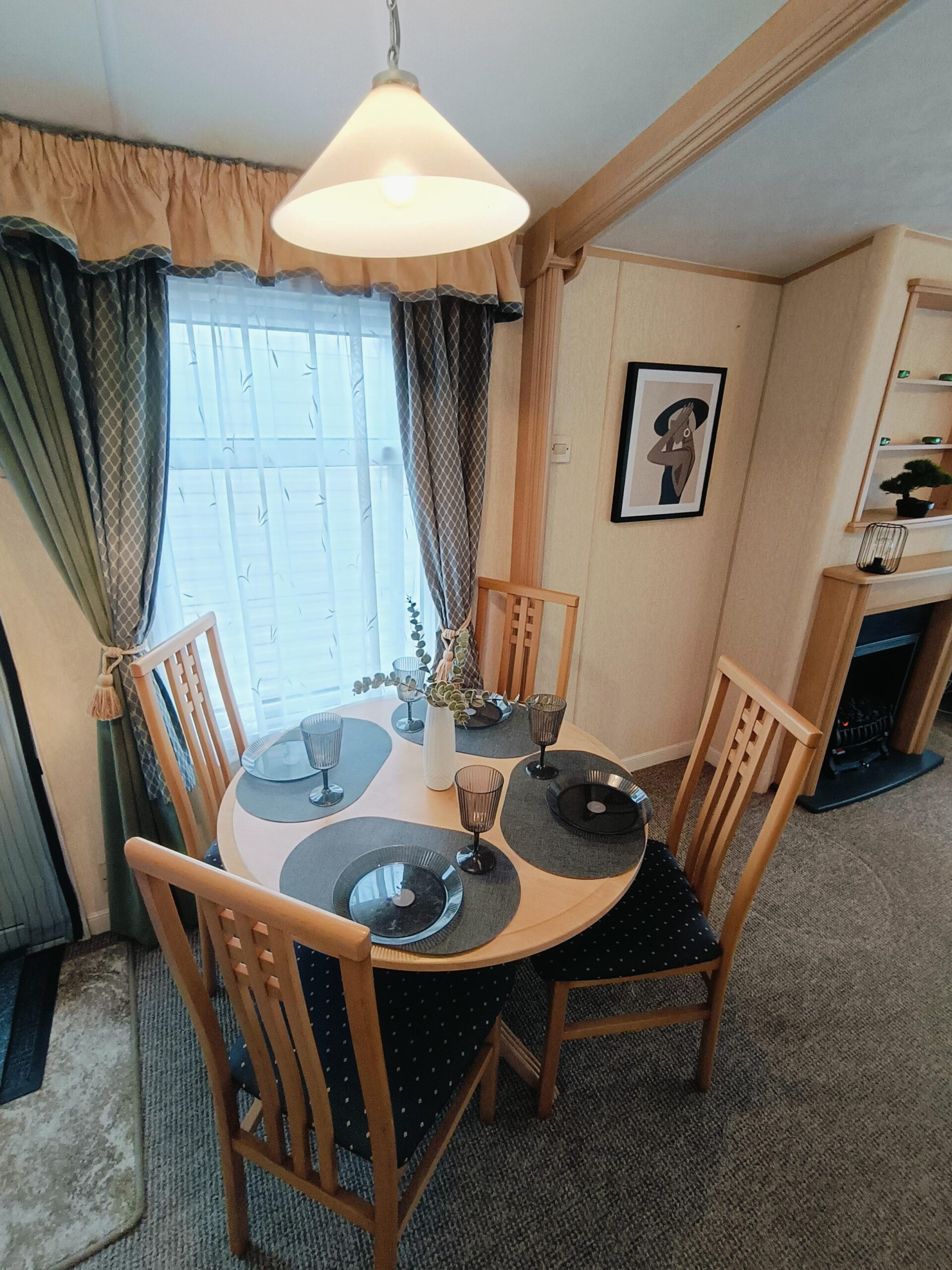W pełni izolowany domek holenderski z drzwiami PCV, wyjściem ogrodowym, duży przestronny salon, w którym znajduje się kominek, jadalnia.