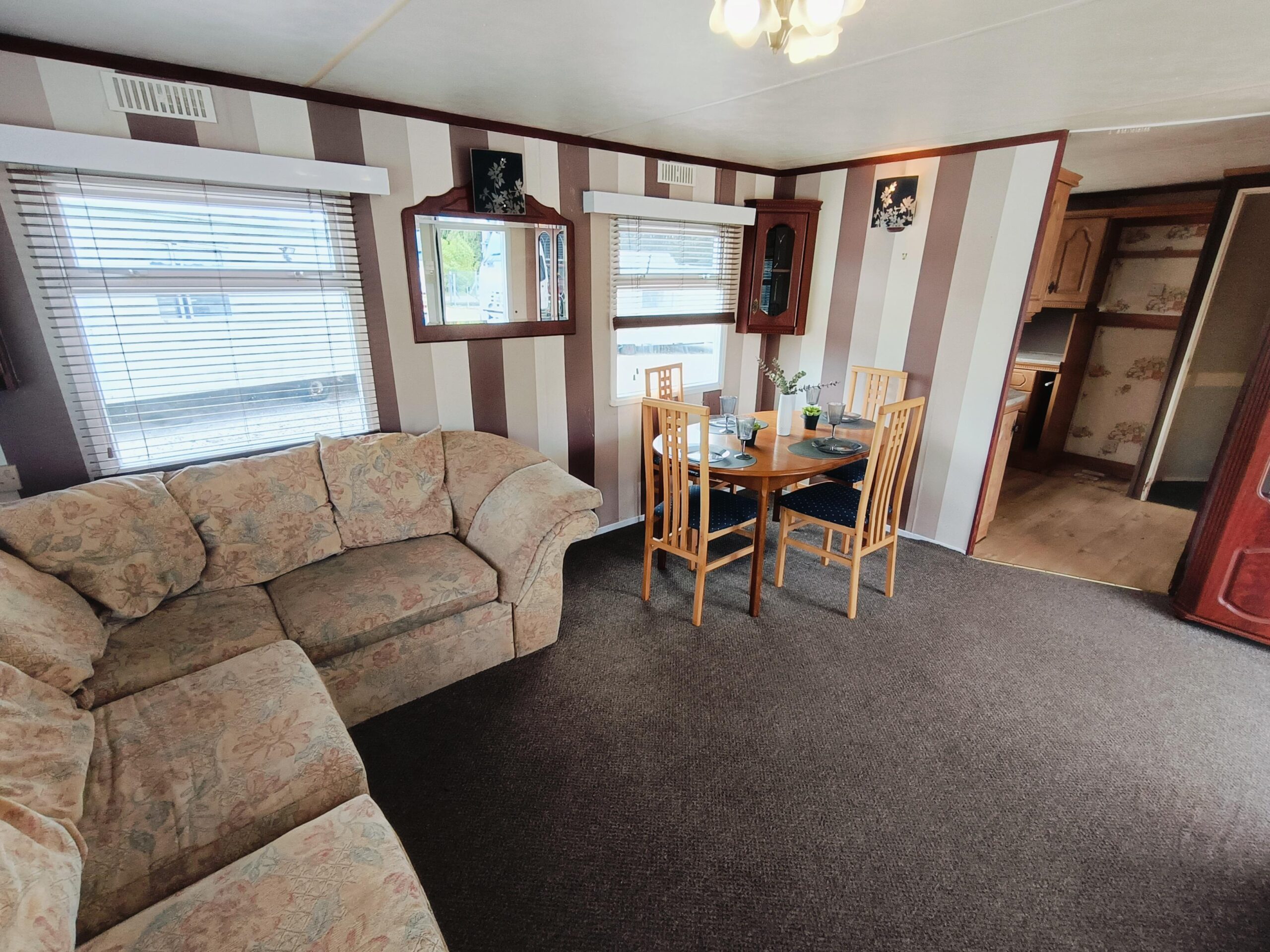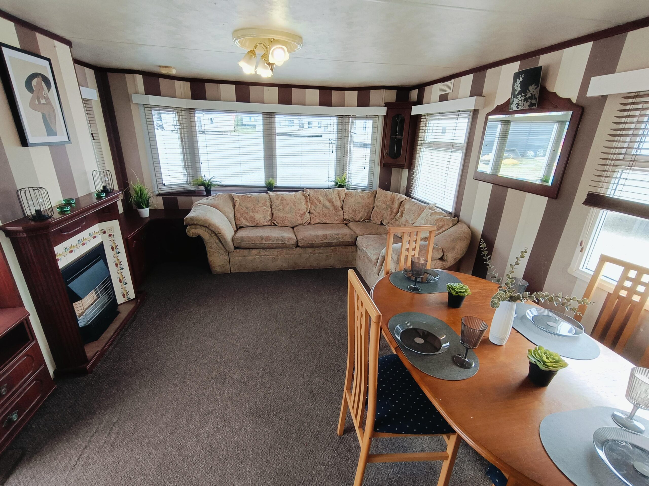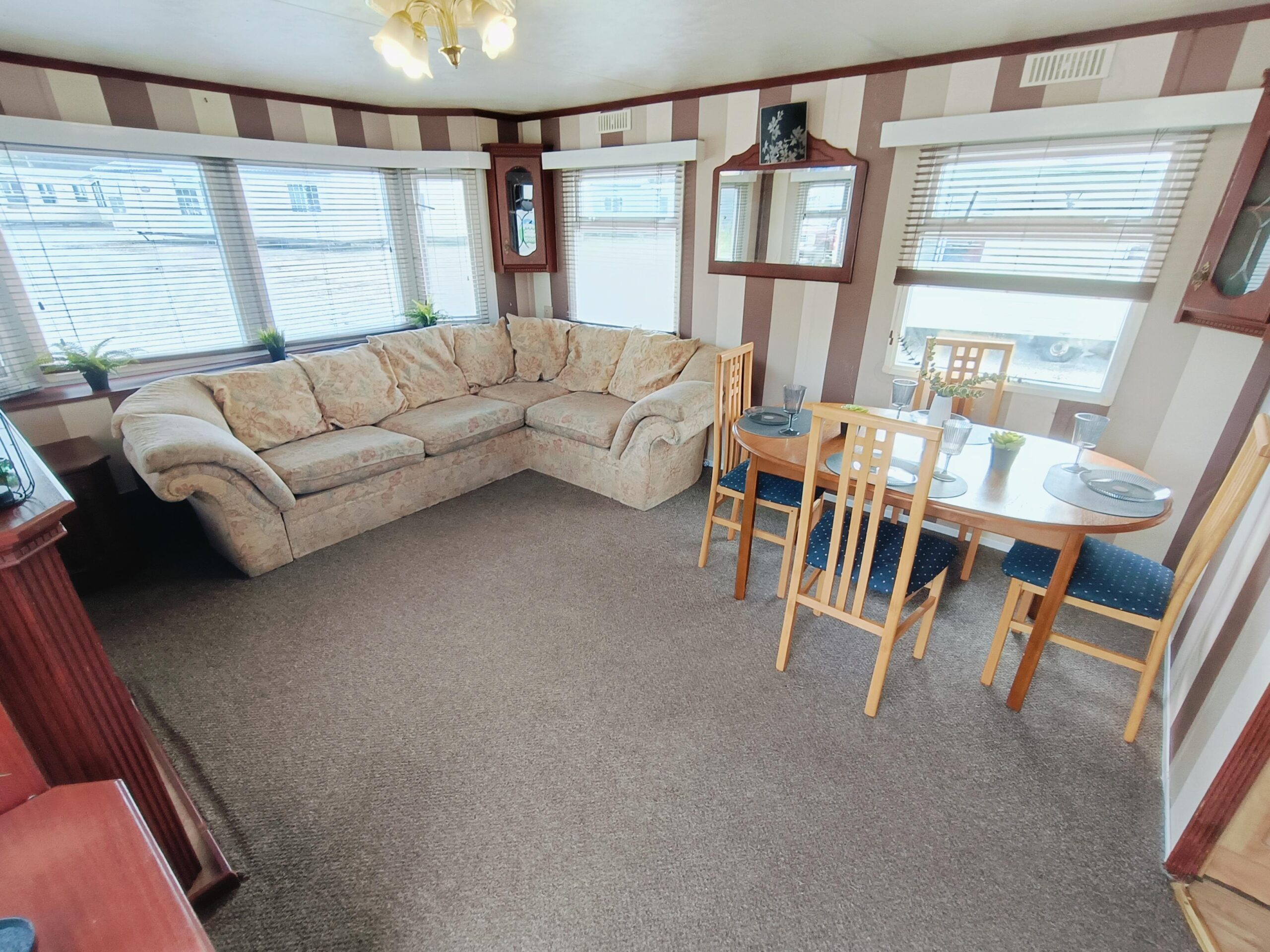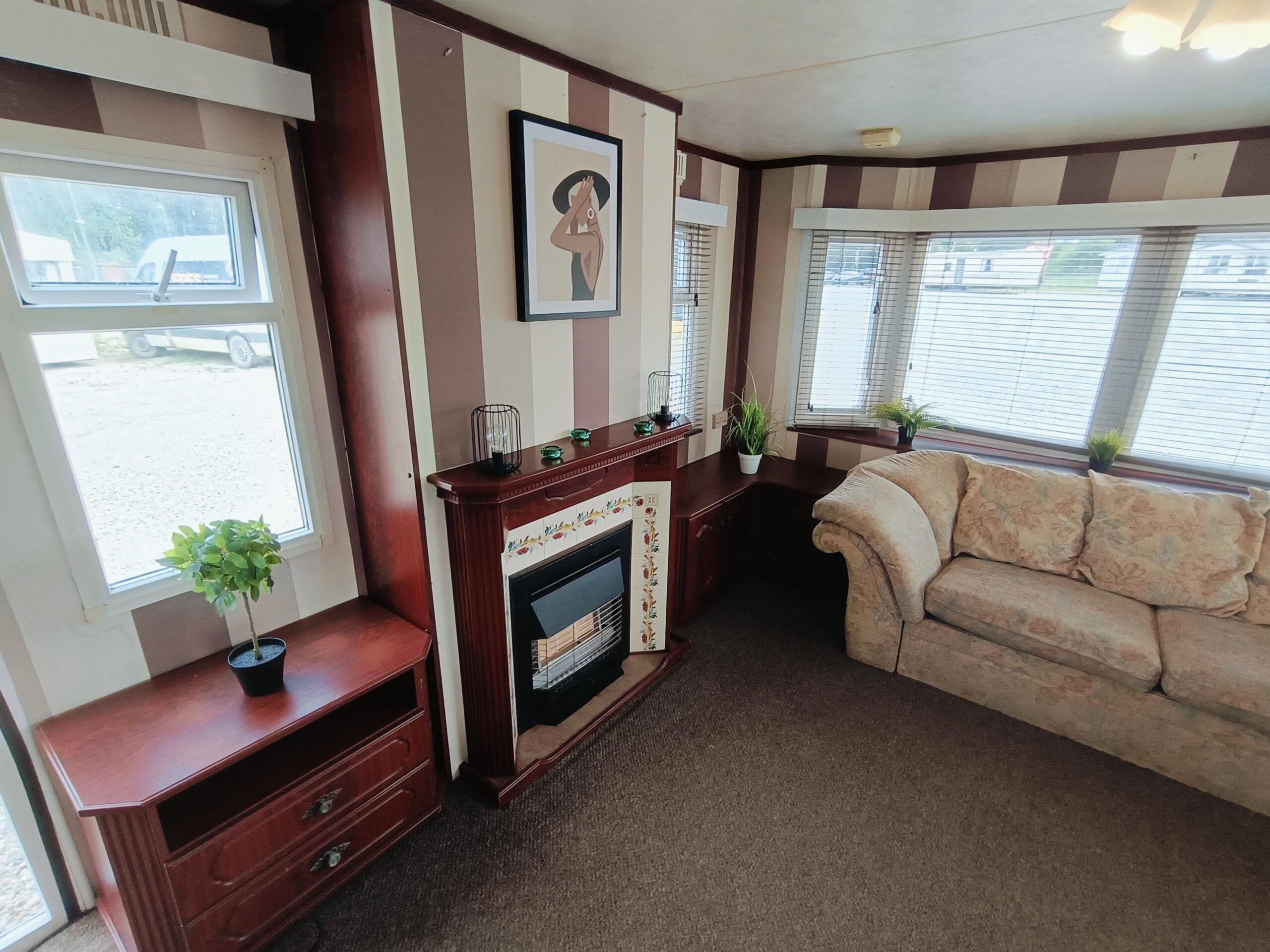 Domek CAŁOROCZNY drzwiami PCV i dużym przestronnym salonem, w którym znajduje się kominek gazowy i wygodna rozkładana sofa.