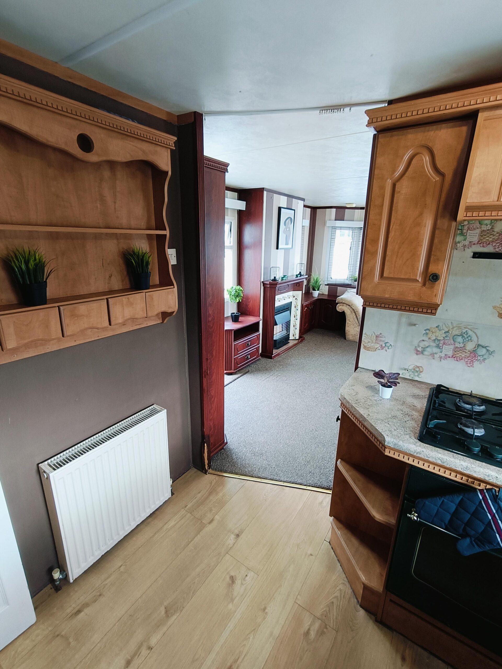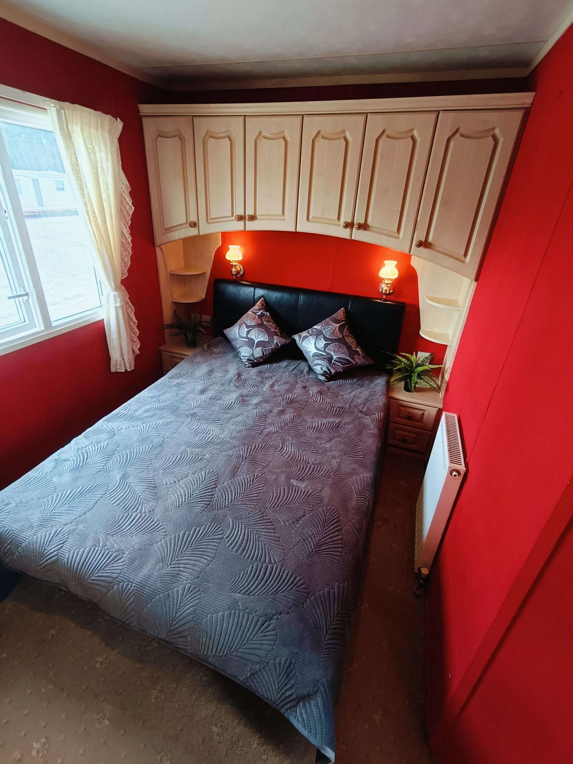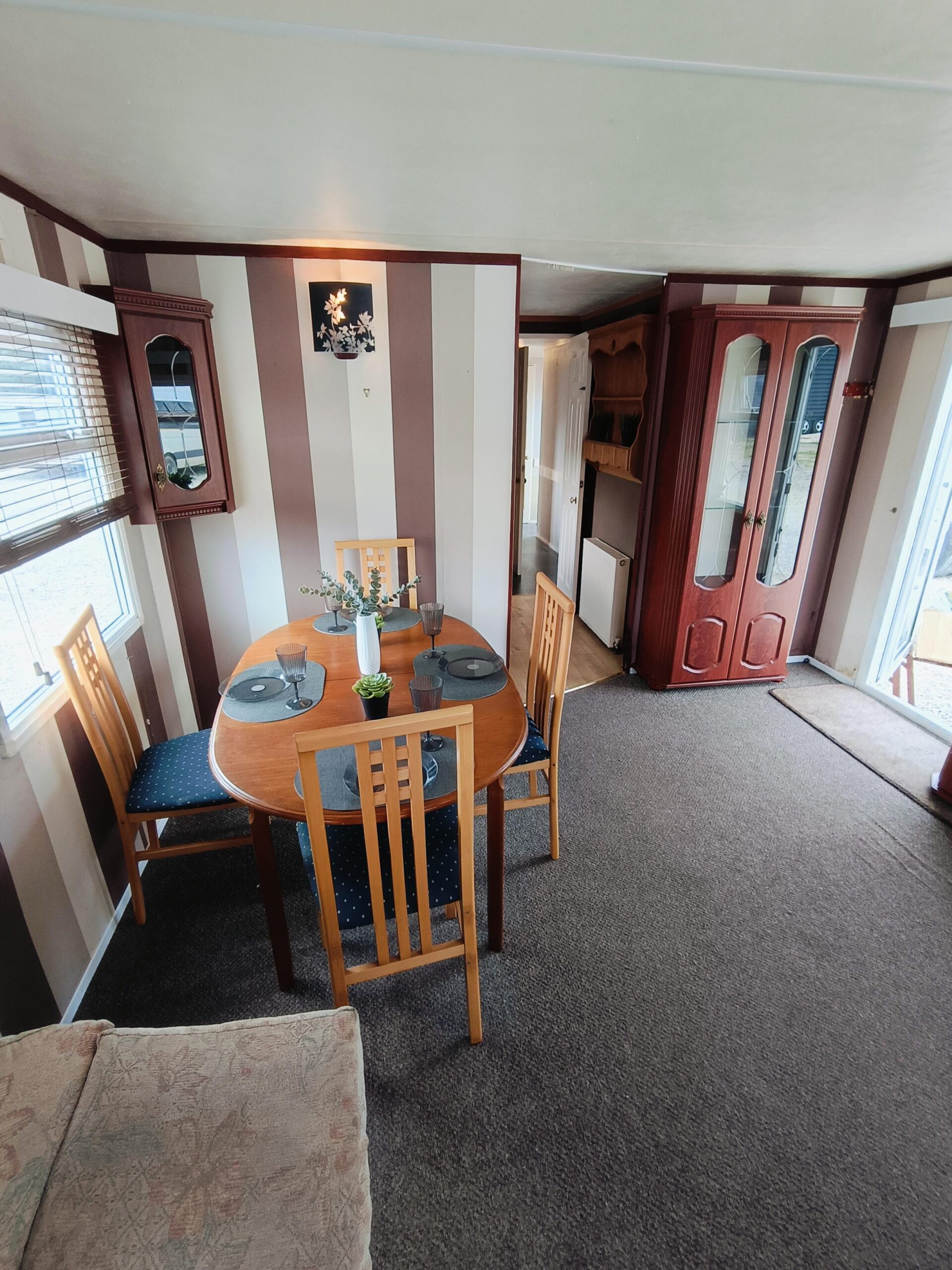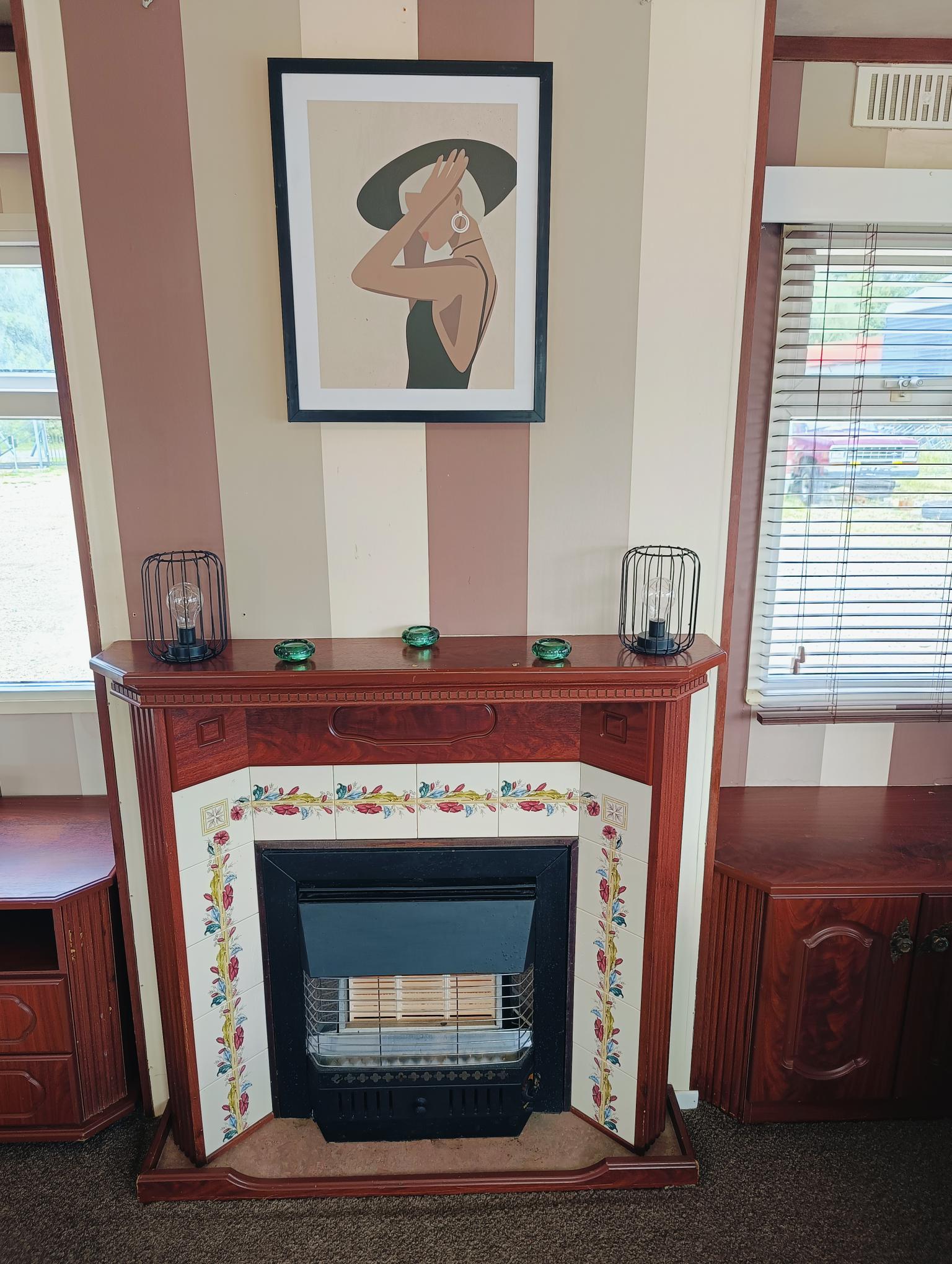 Domek CAŁOROCZNY drzwiami PCV i dużym przestronnym salonem, w którym znajduje się kominek gazowy i wygodna rozkładana sofa.