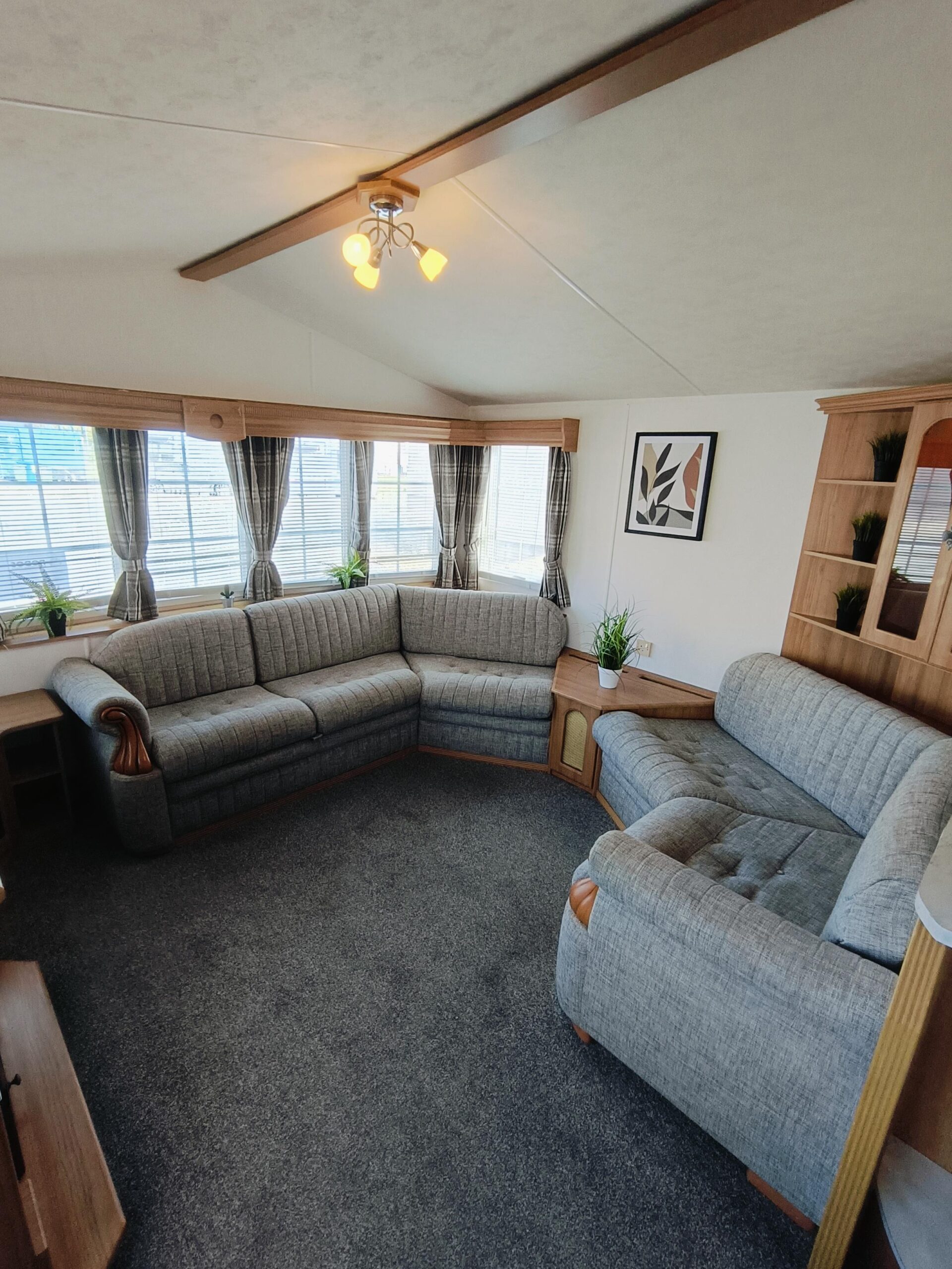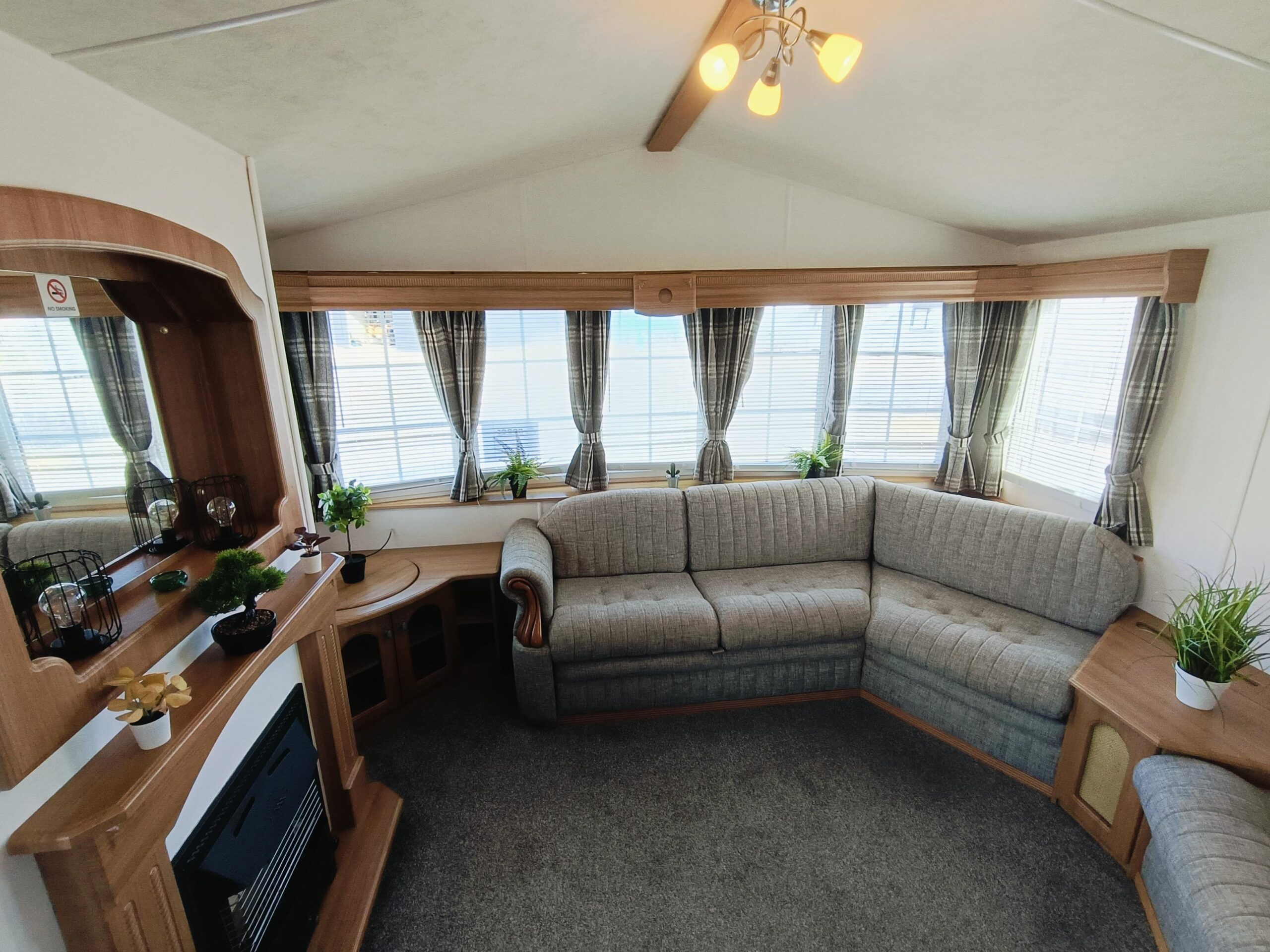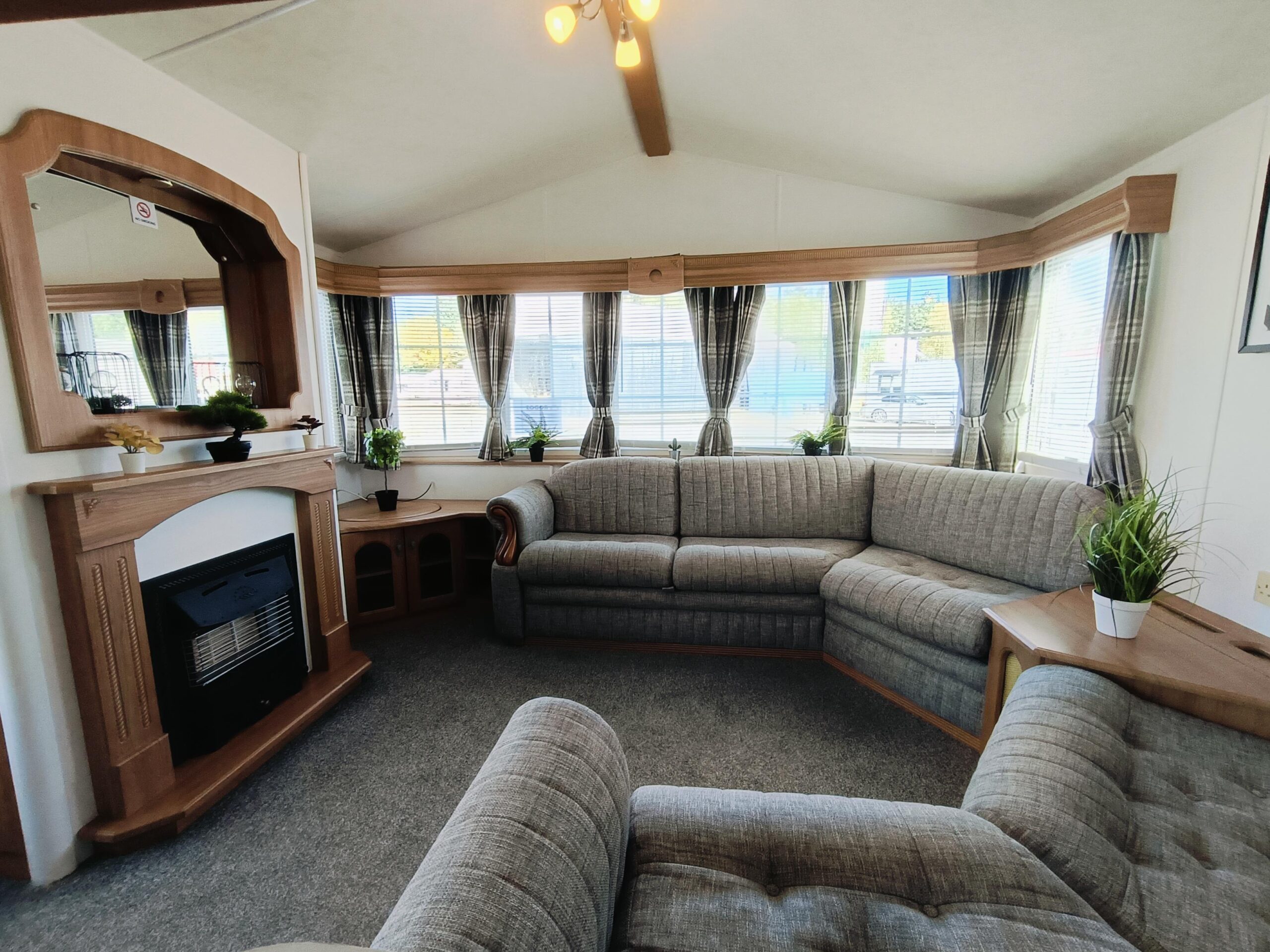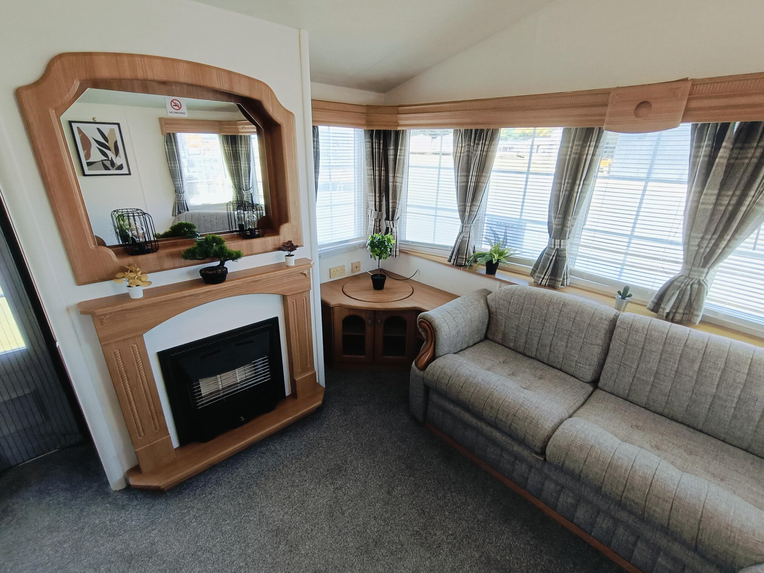Domek CAŁOROCZNY drzwiami PCV i dużym przestronnym salonem, w którym znajduje się kominek gazowy i wygodna rozkładana sofa.