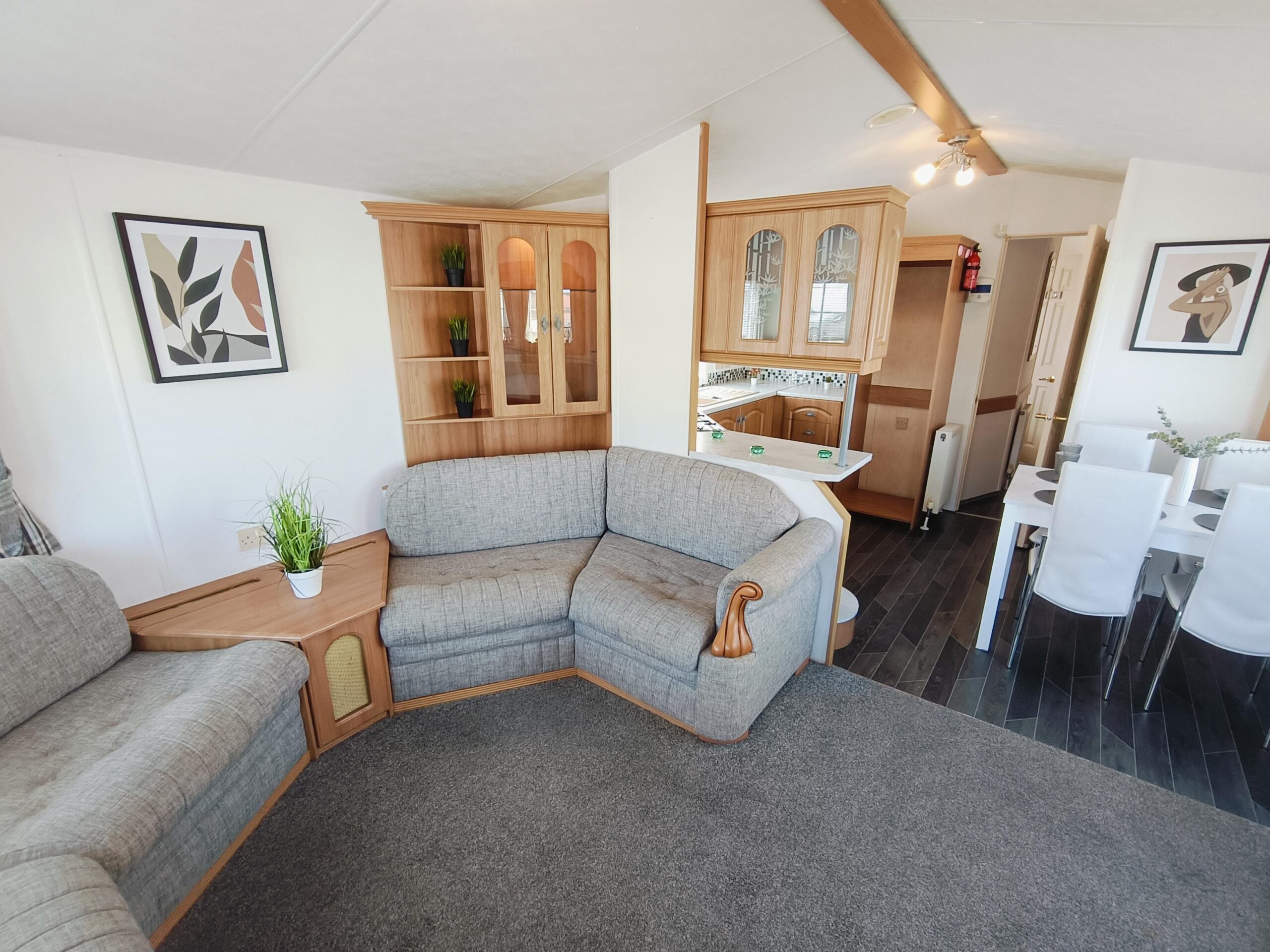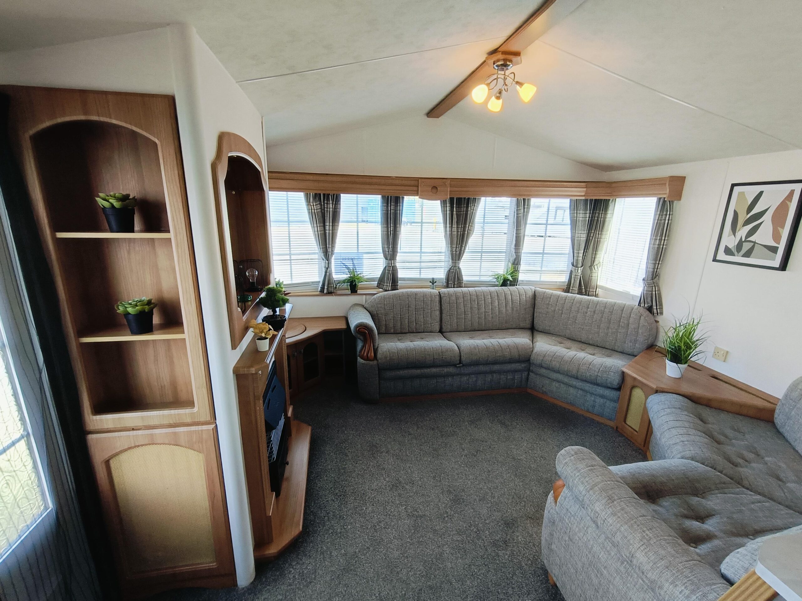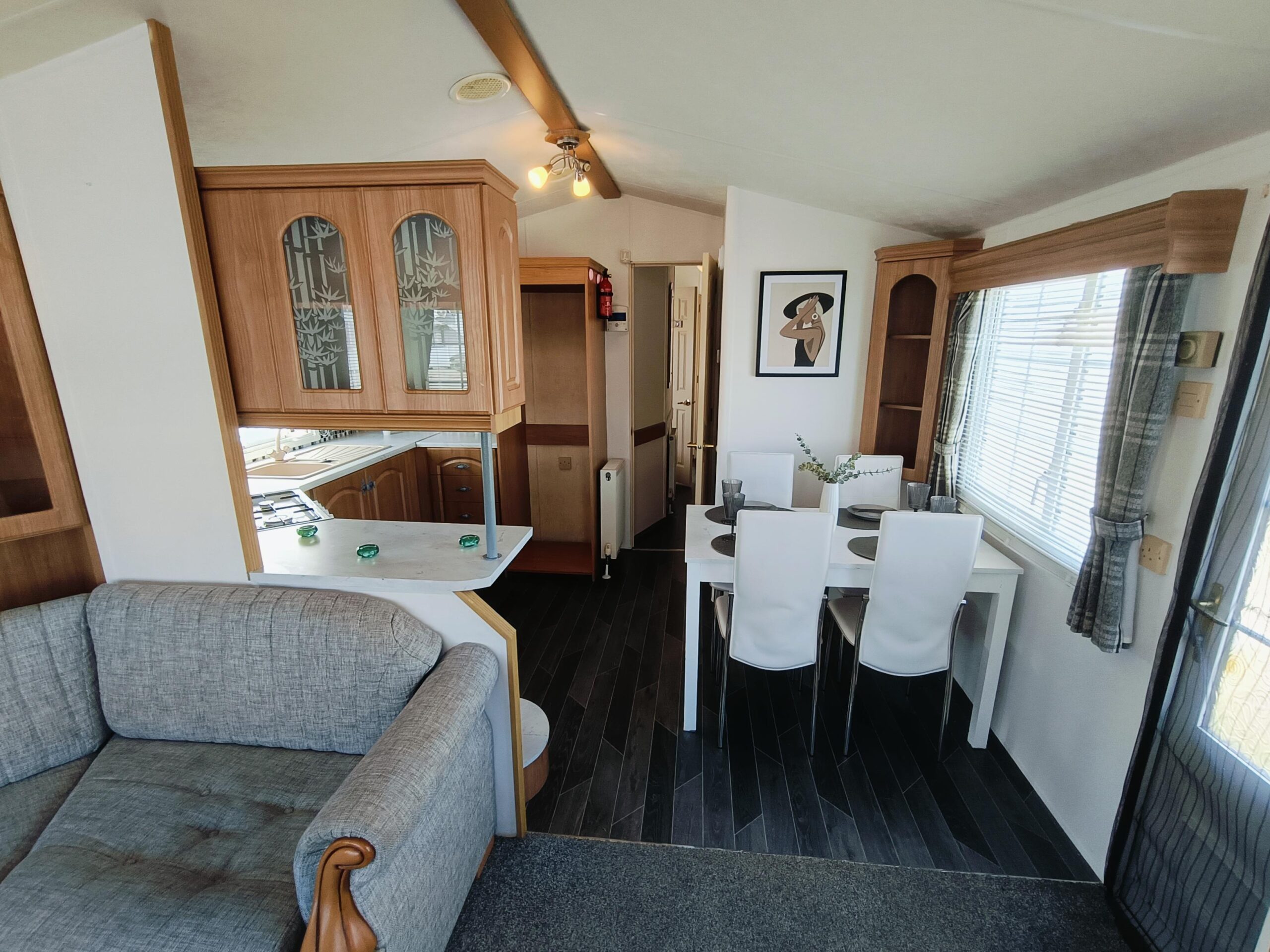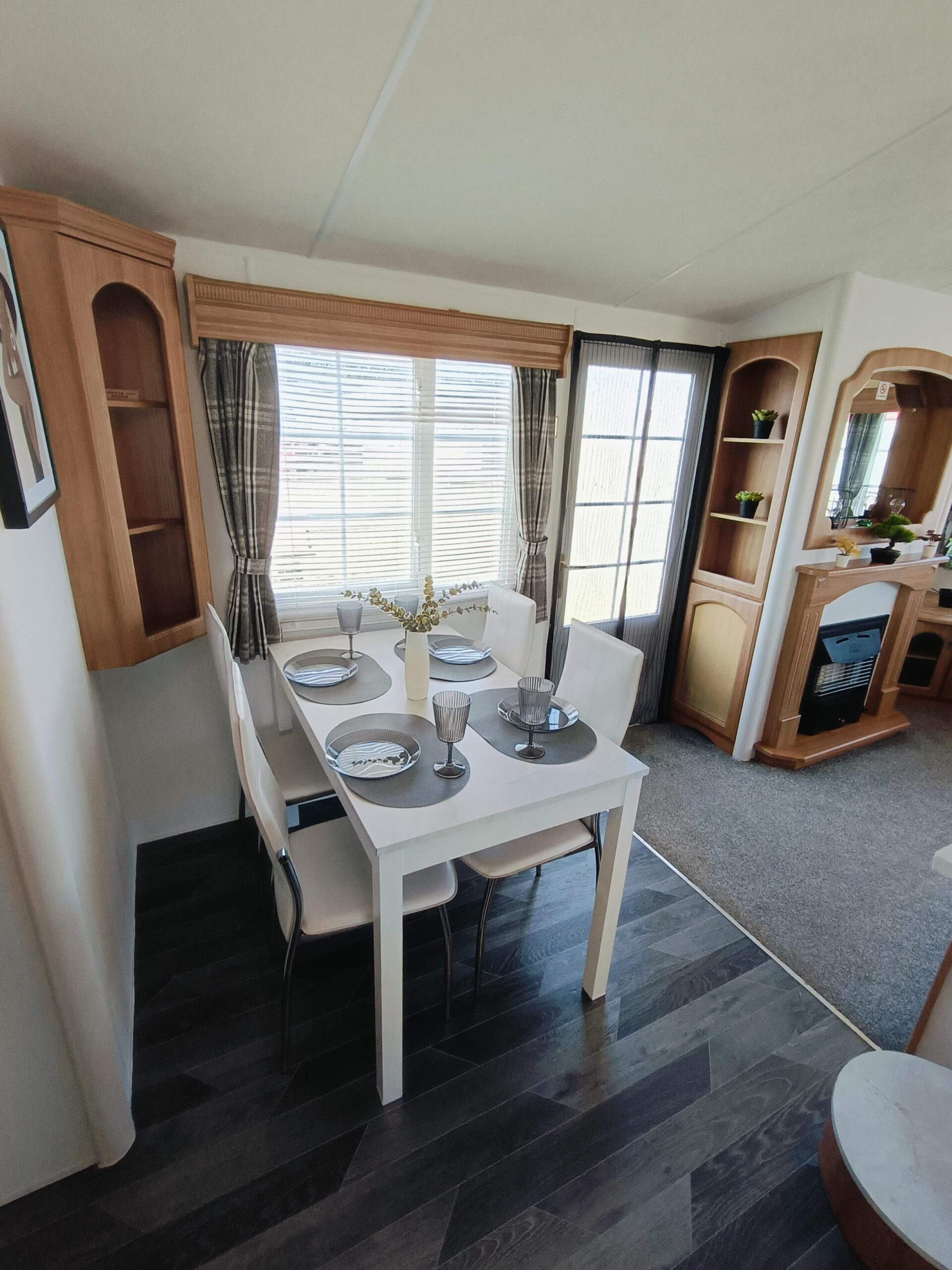 Domek CAŁOROCZNY drzwiami PCV i dużym przestronnym salonem, w którym znajduje się kominek gazowy i wygodna rozkładana sofa.