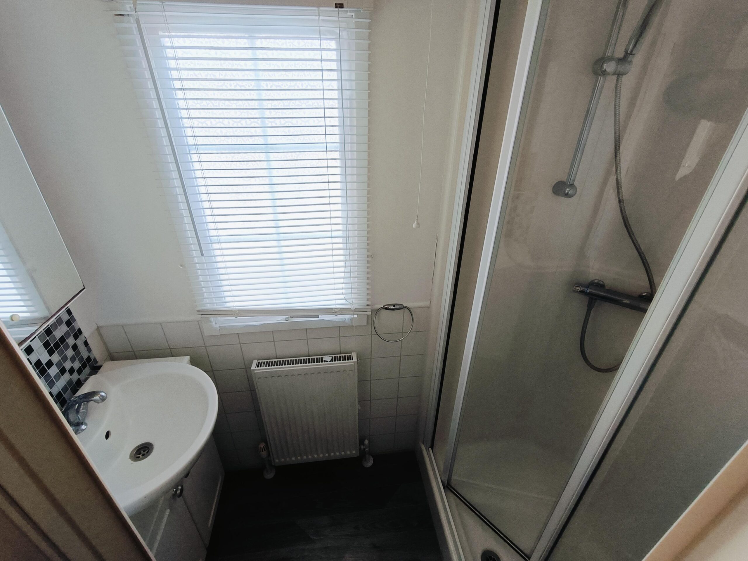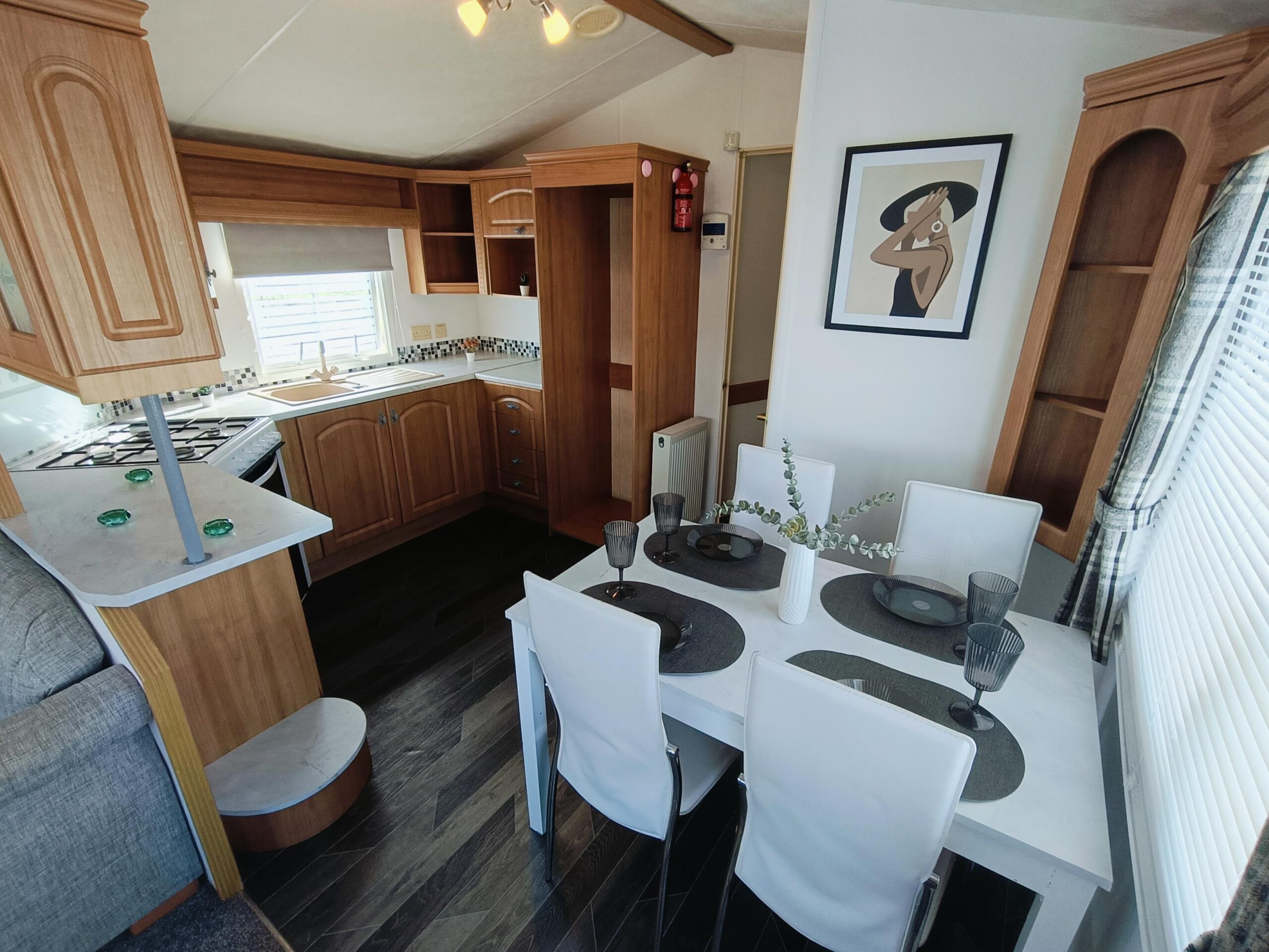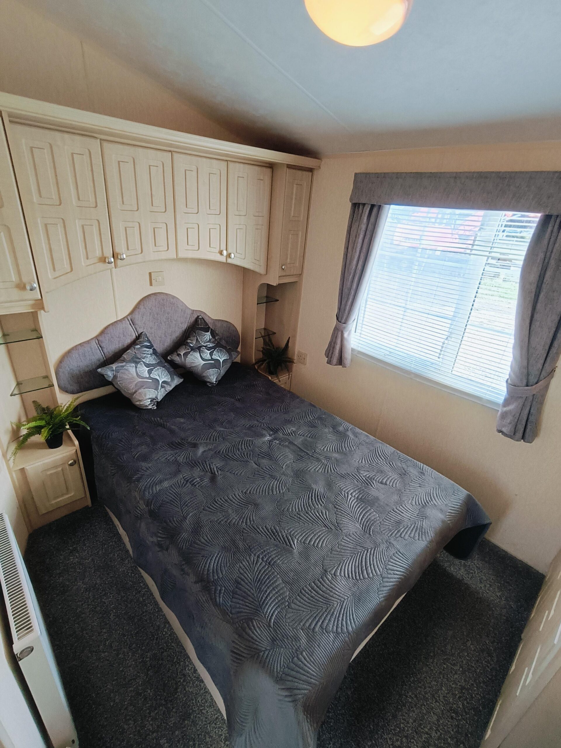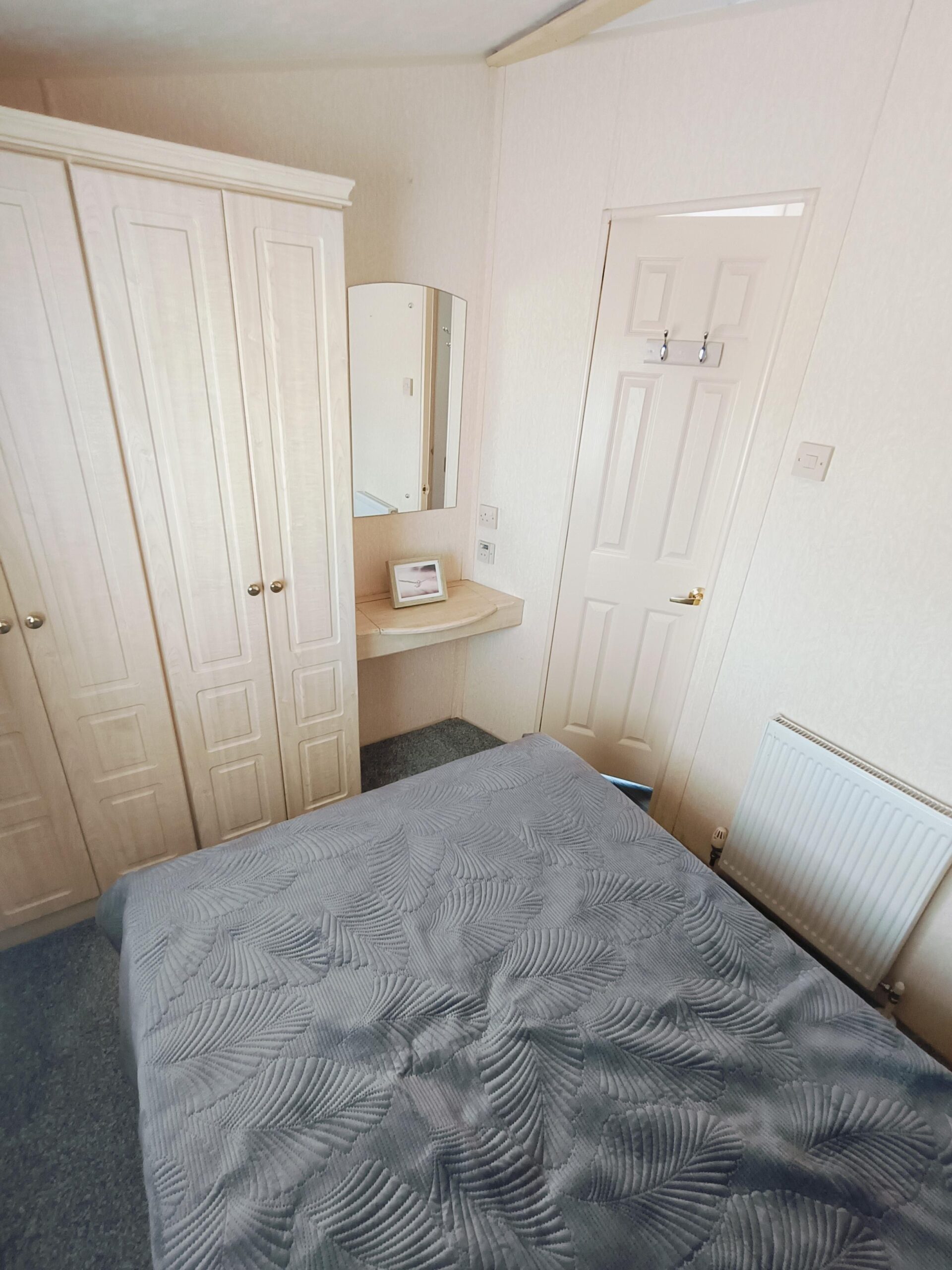 Domek CAŁOROCZNY drzwiami PCV i dużym przestronnym salonem, w którym znajduje się kominek gazowy i wygodna rozkładana sofa.