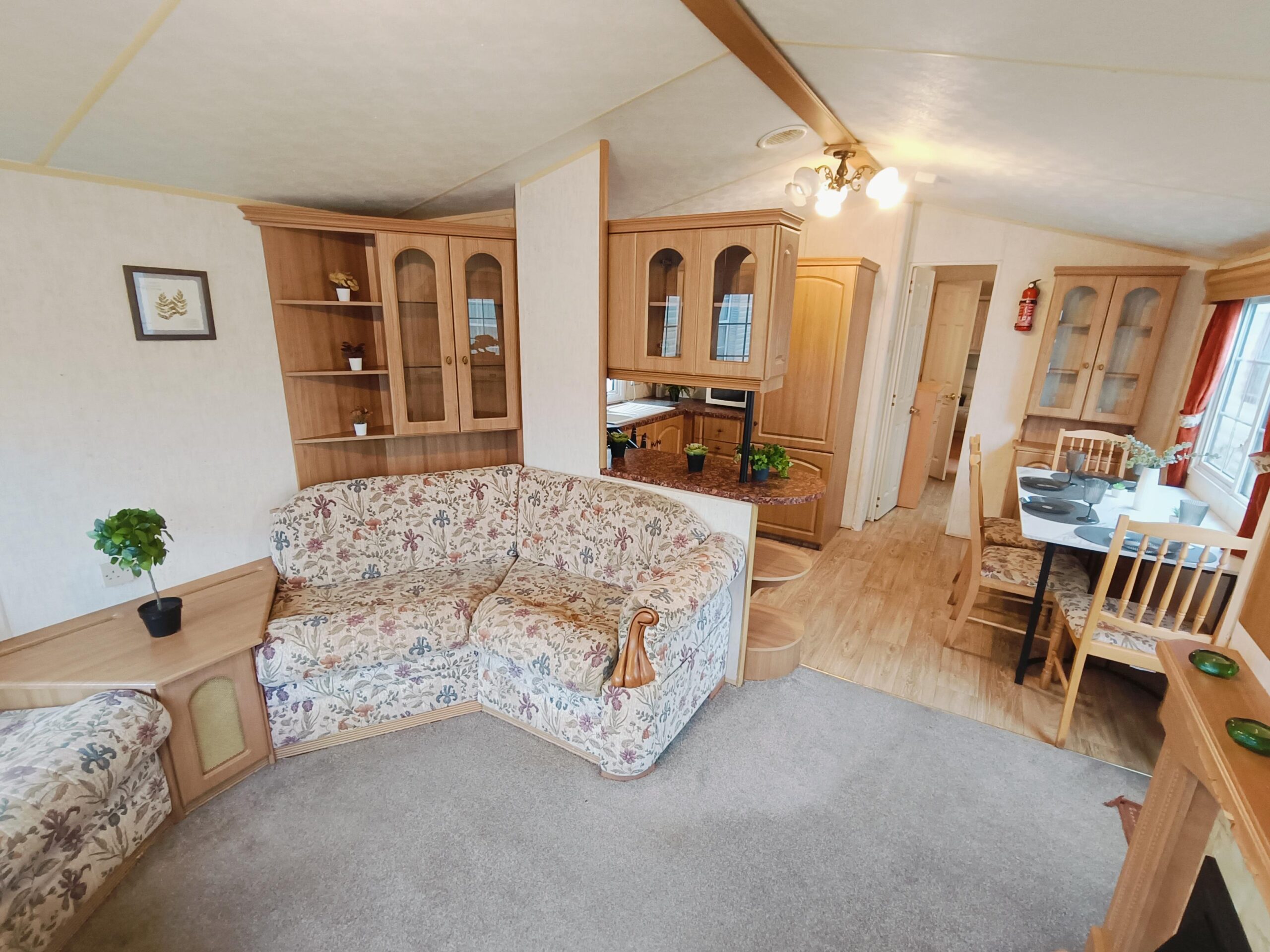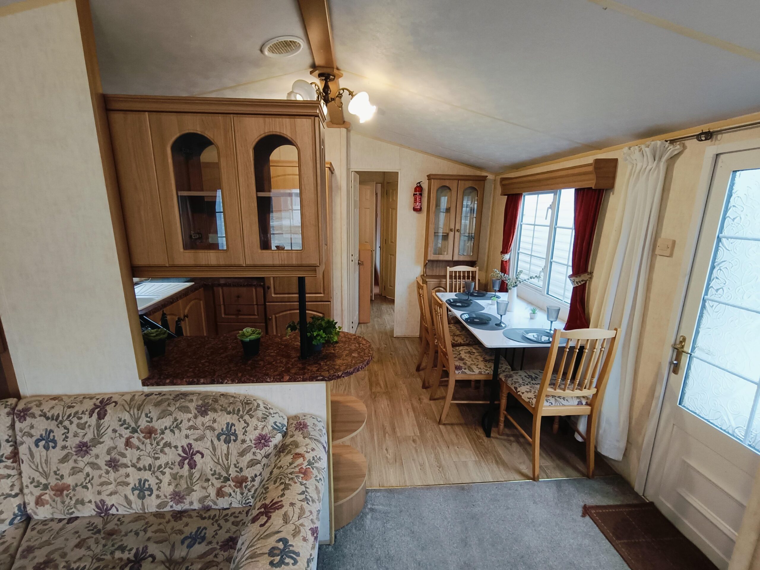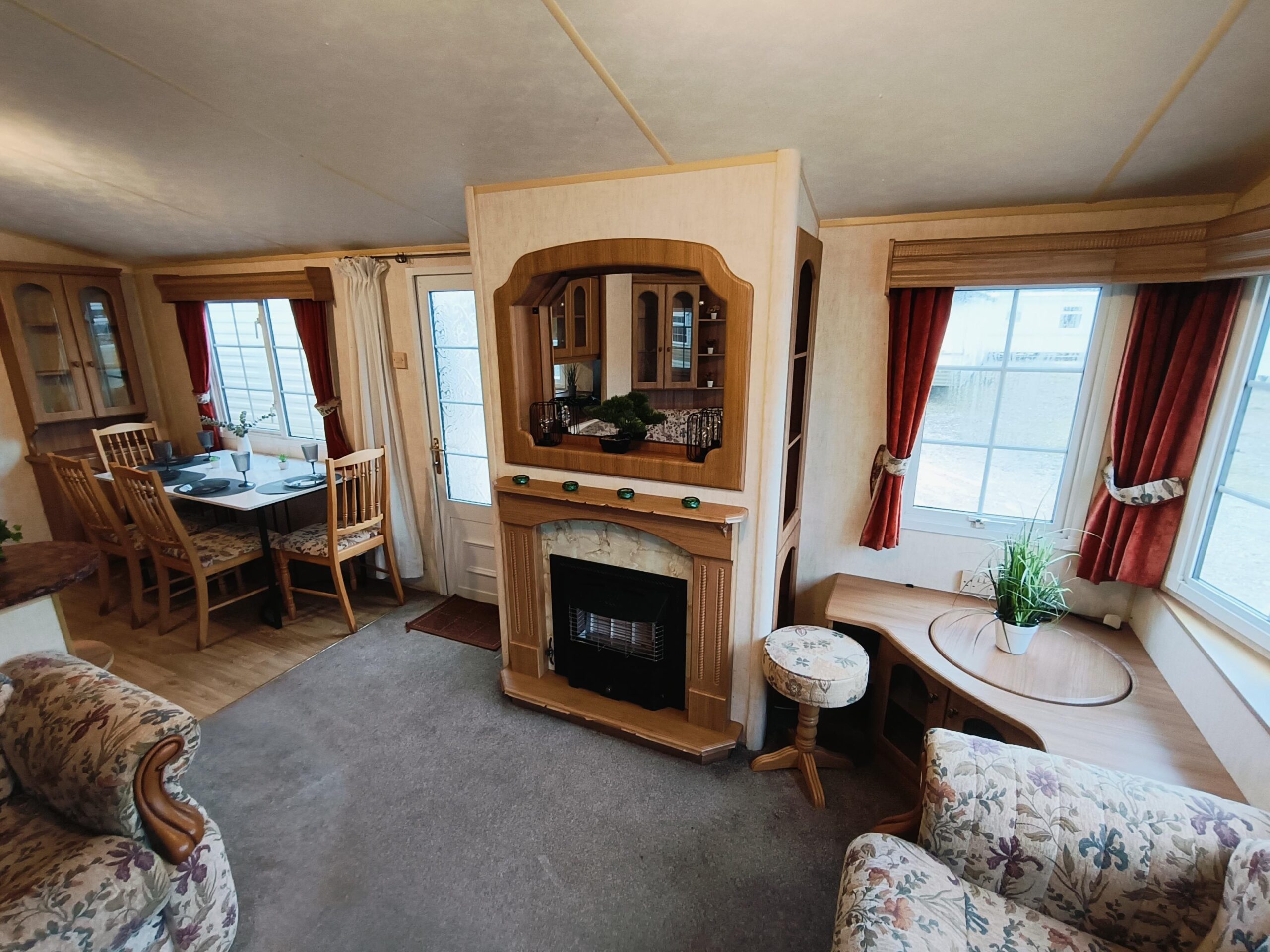 Domek CAŁOROCZNY drzwiami PCV i dużym przestronnym salonem, w którym znajduje się kominek gazowy i wygodna sofa.
