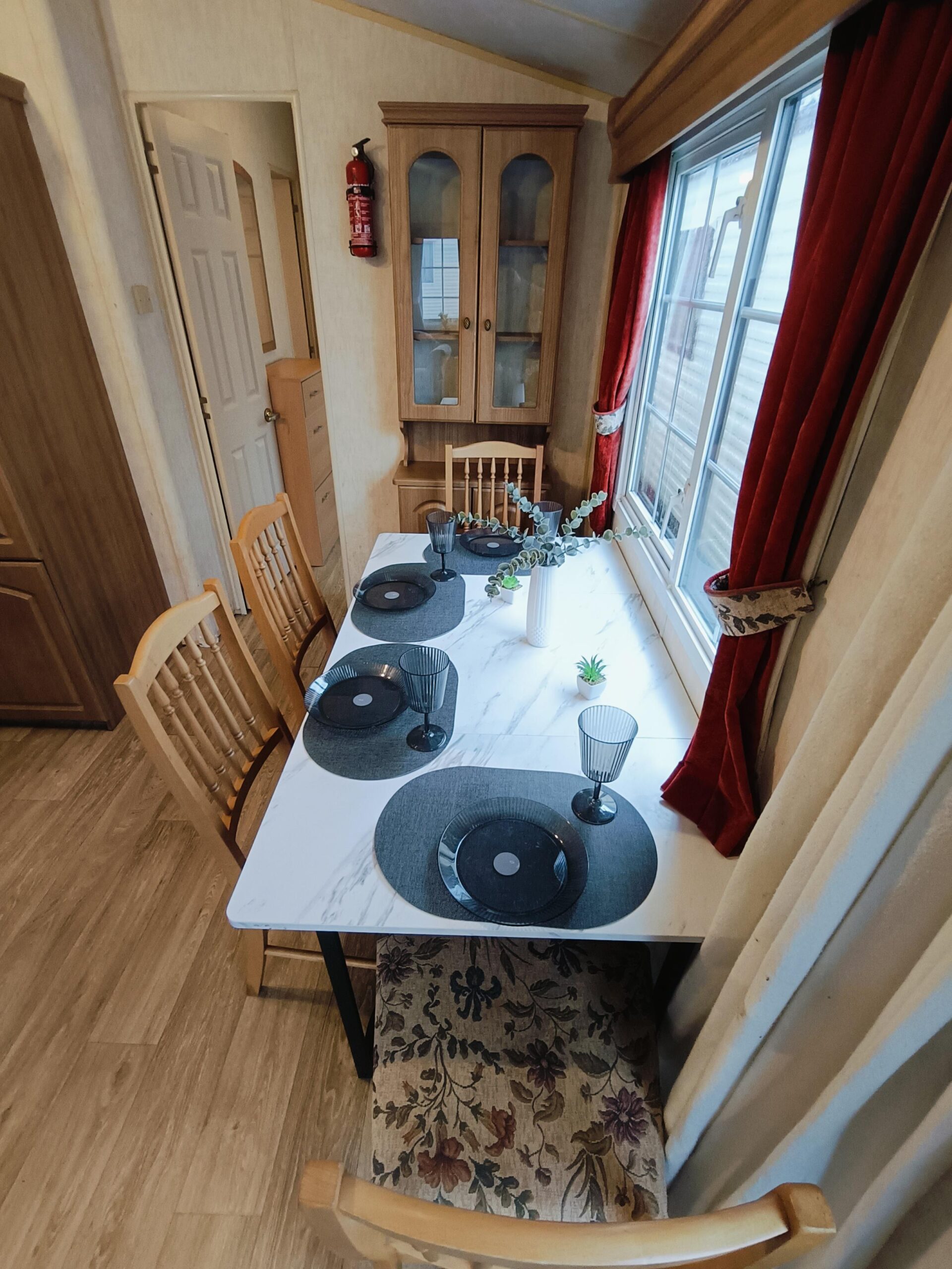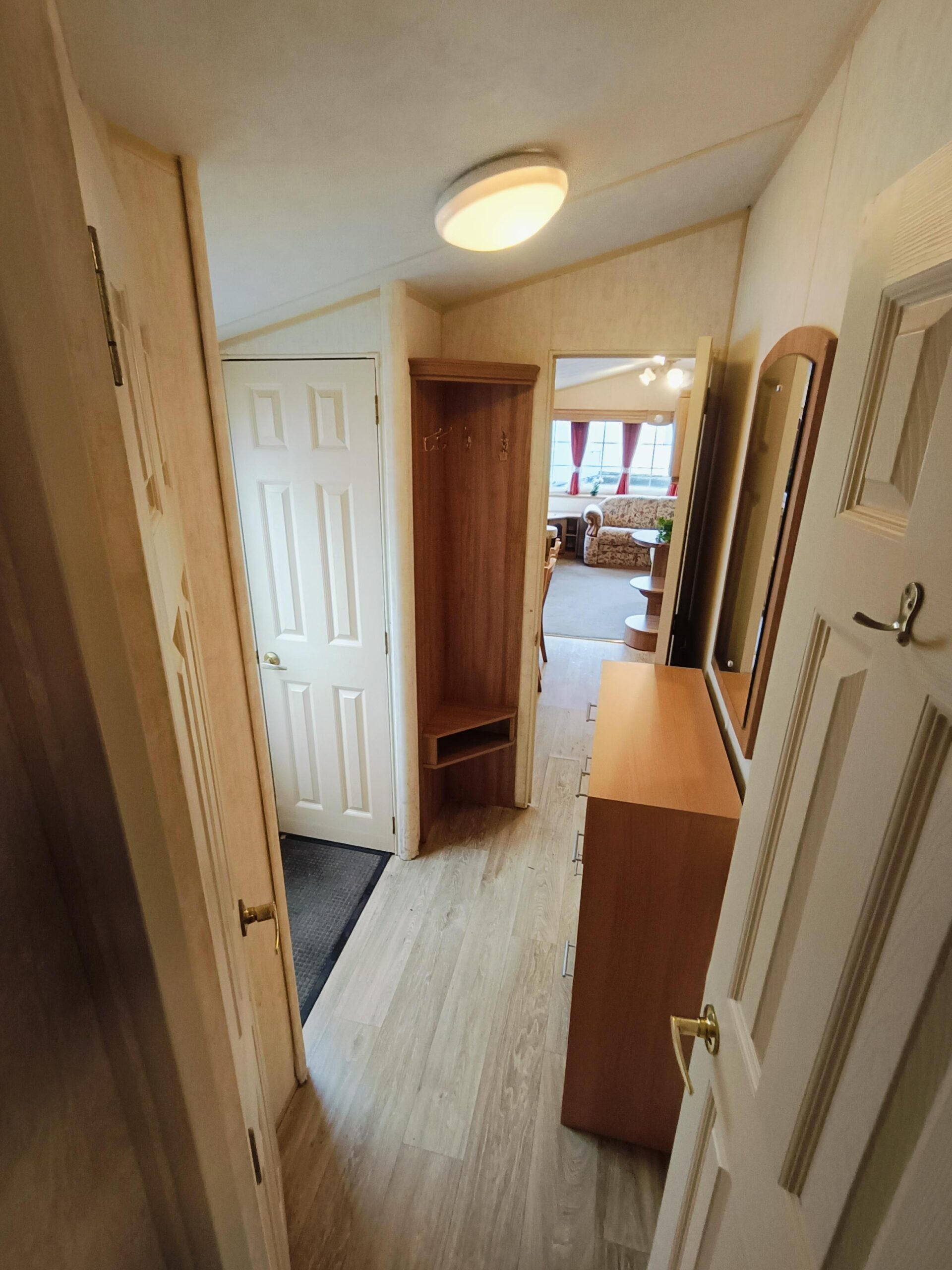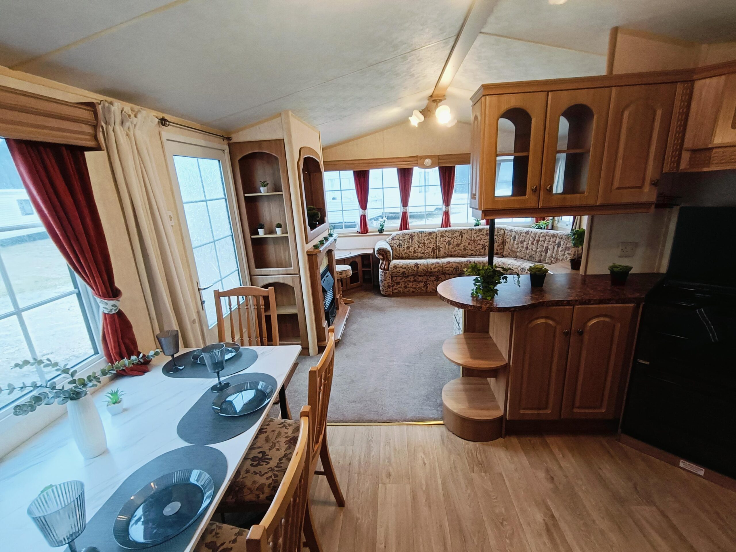Domek CAŁOROCZNY drzwiami PCV i dużym przestronnym salonem, w którym znajduje się kominek gazowy i wygodna sofa.