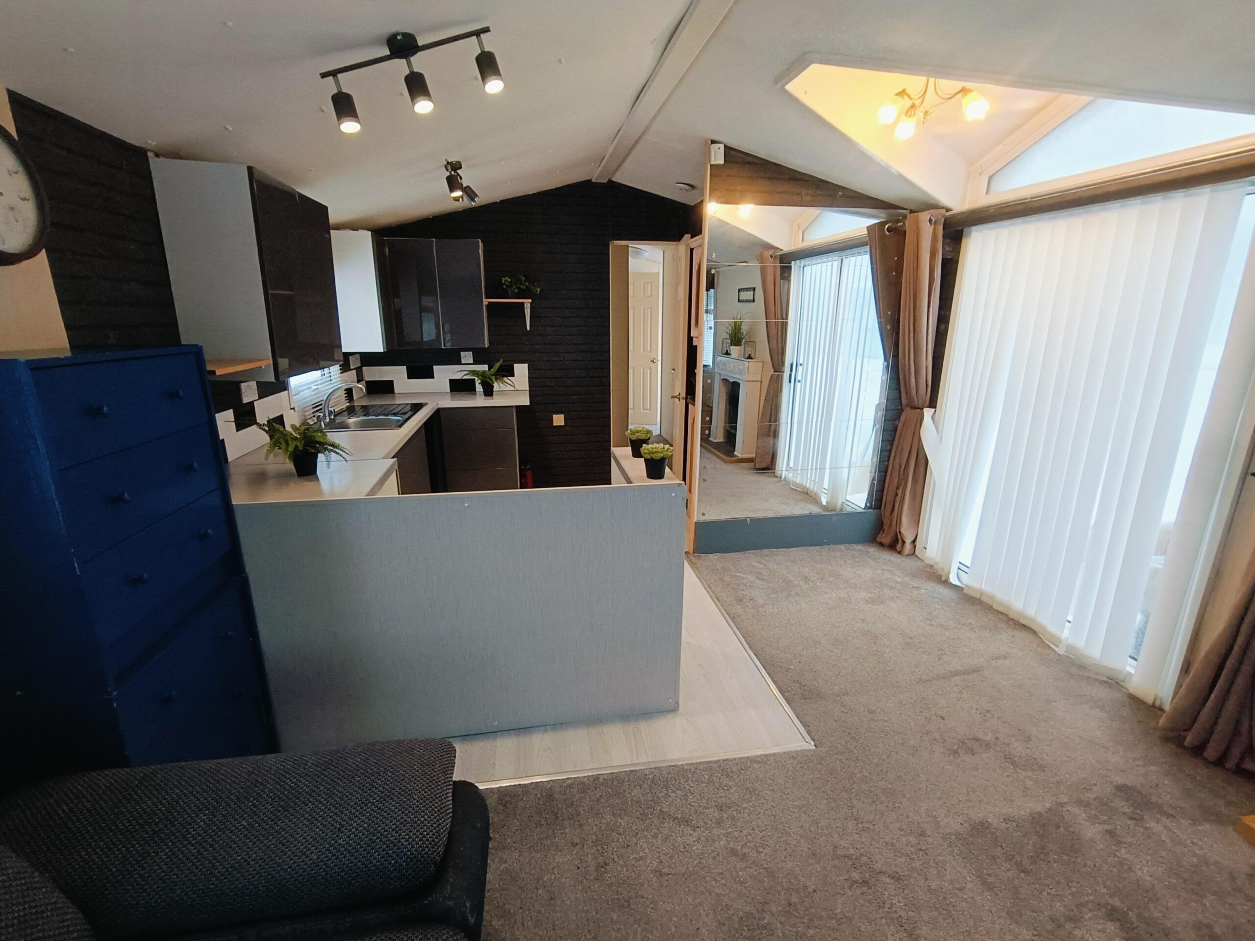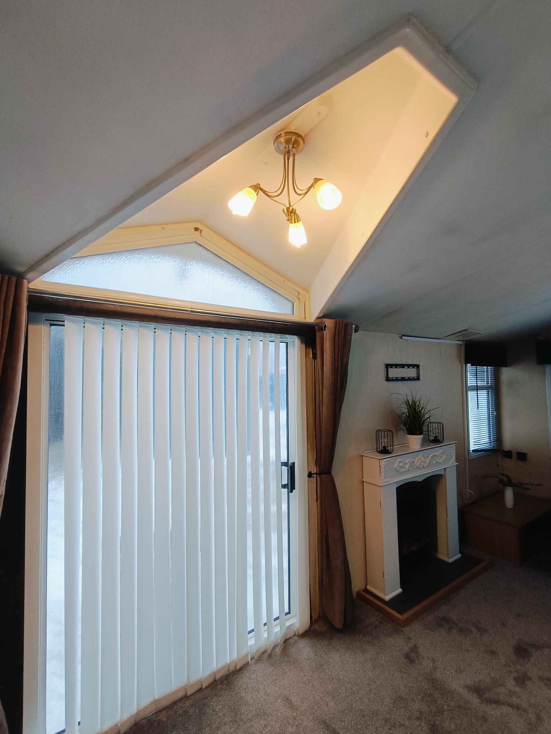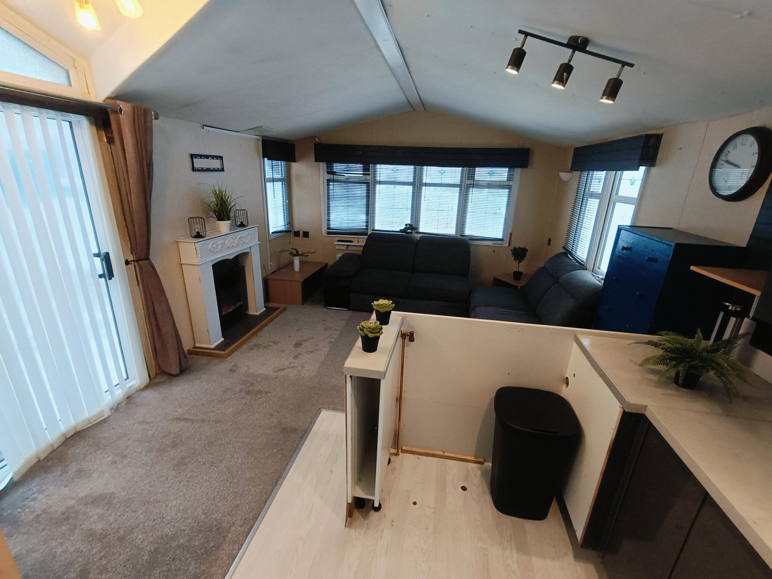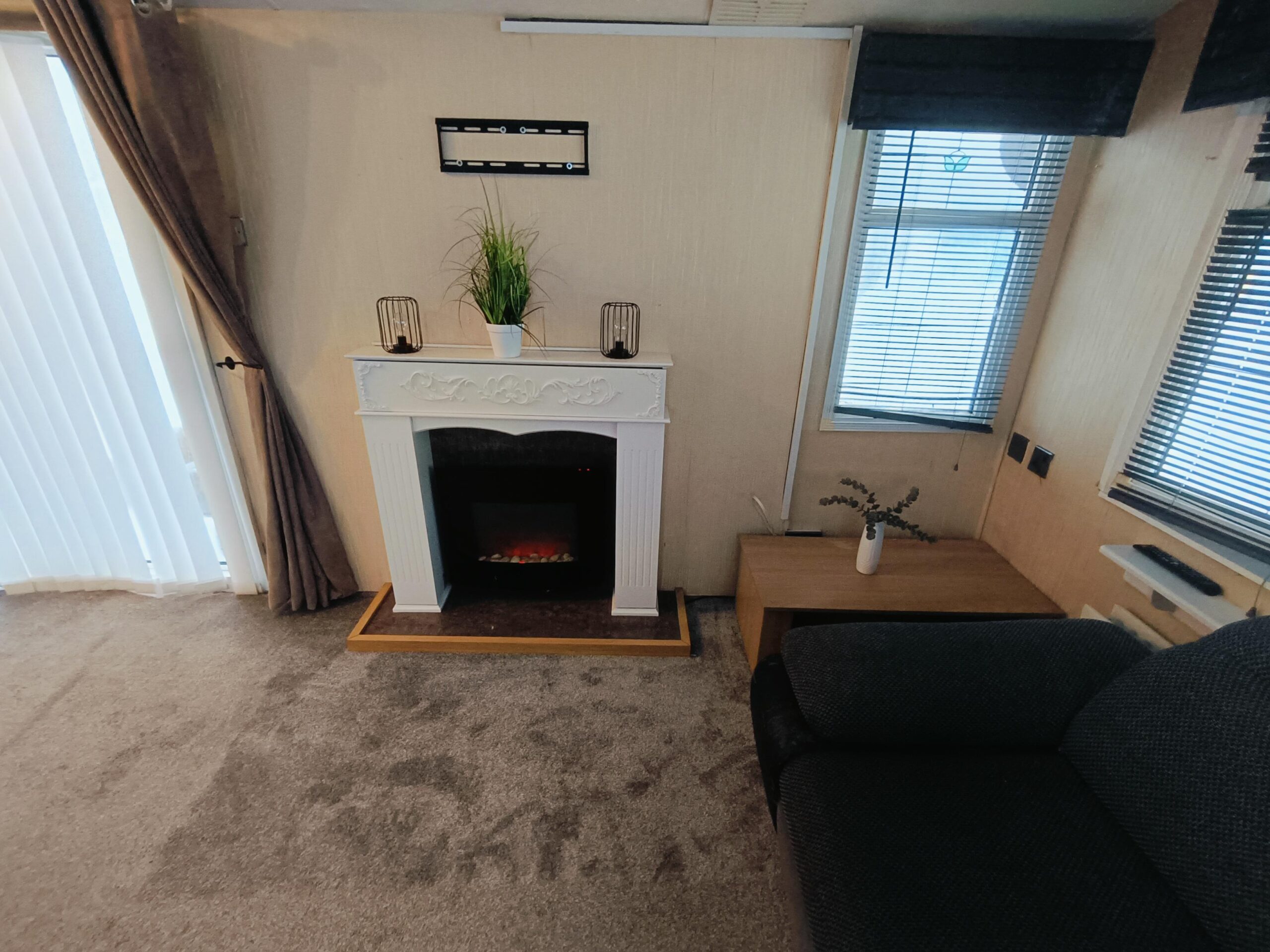 Domek CAŁOROCZNY drzwiami PCV i dużym przestronnym salonem, w którym znajduje się kominek elektryczny i wygodna rozkładana sofa.